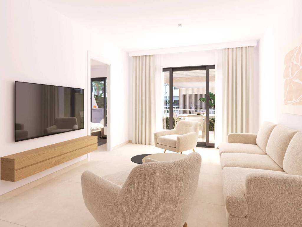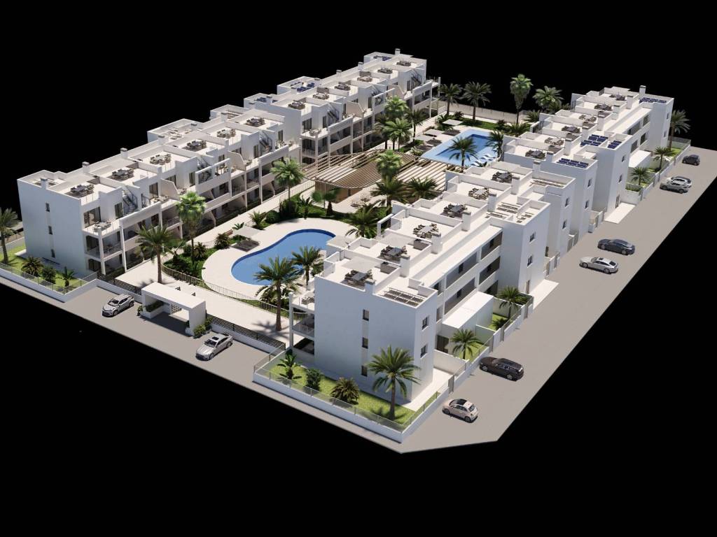 La promoción consta de 72 apartamentos de 2 y 3 dormitorios y 2 baños, uno de ellos en suite, distribuidos en cuatro modernos edificios. También está prevista una segunda fase con bungalows y villas, lo que añadirá aún más valor y atractivo a la zona.