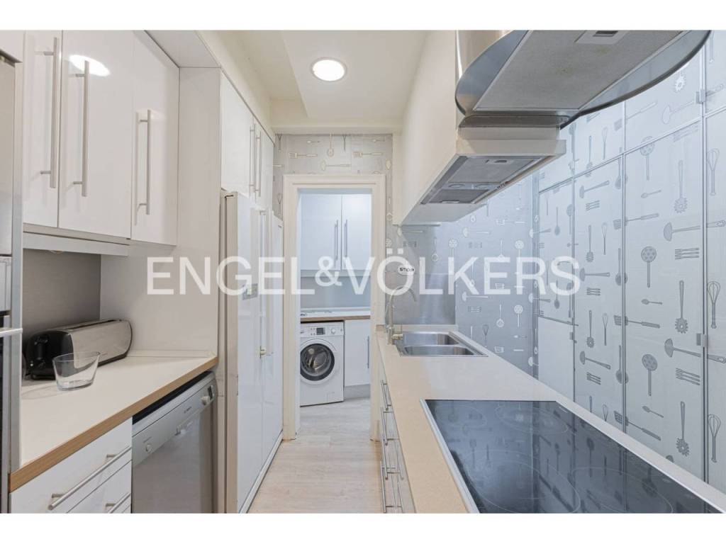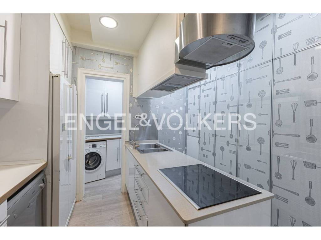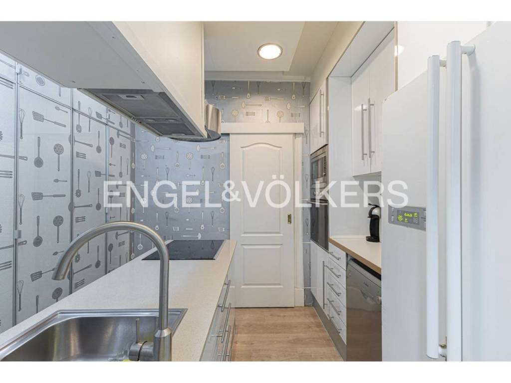 La vivienda dispone de un amplio recibidor que da acceso a un pasillo distribuidor. A la izquierda se encuentra la cocina independiente, totalmente equipada, con salida a lavadero. En la zona de día también cuenta con un baño completo y una habitación de servicio actualmente acondicionada como lavandería.