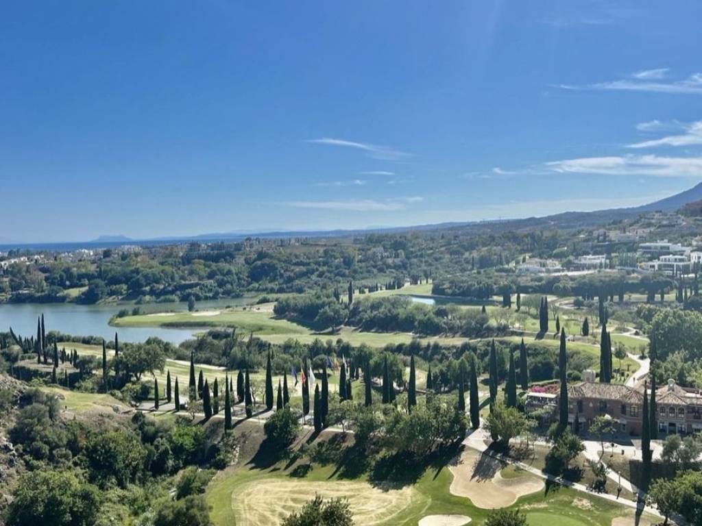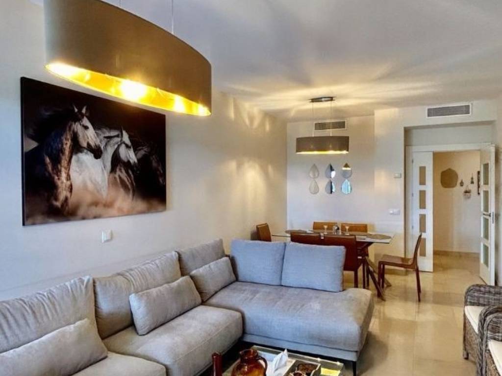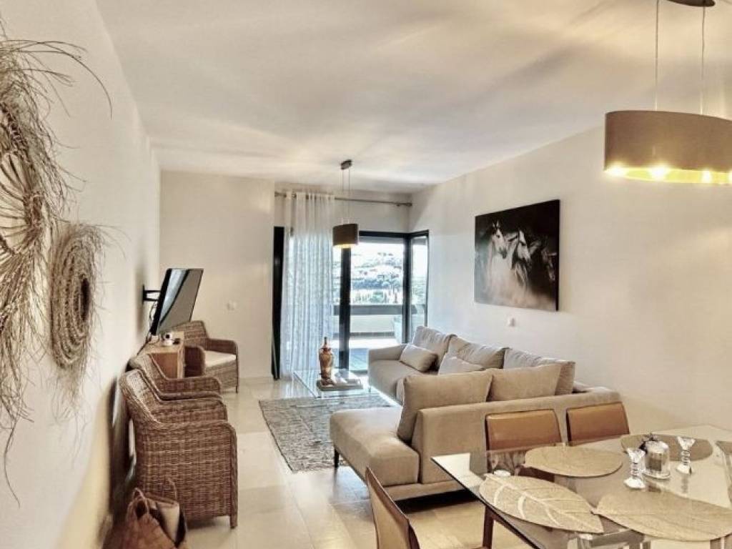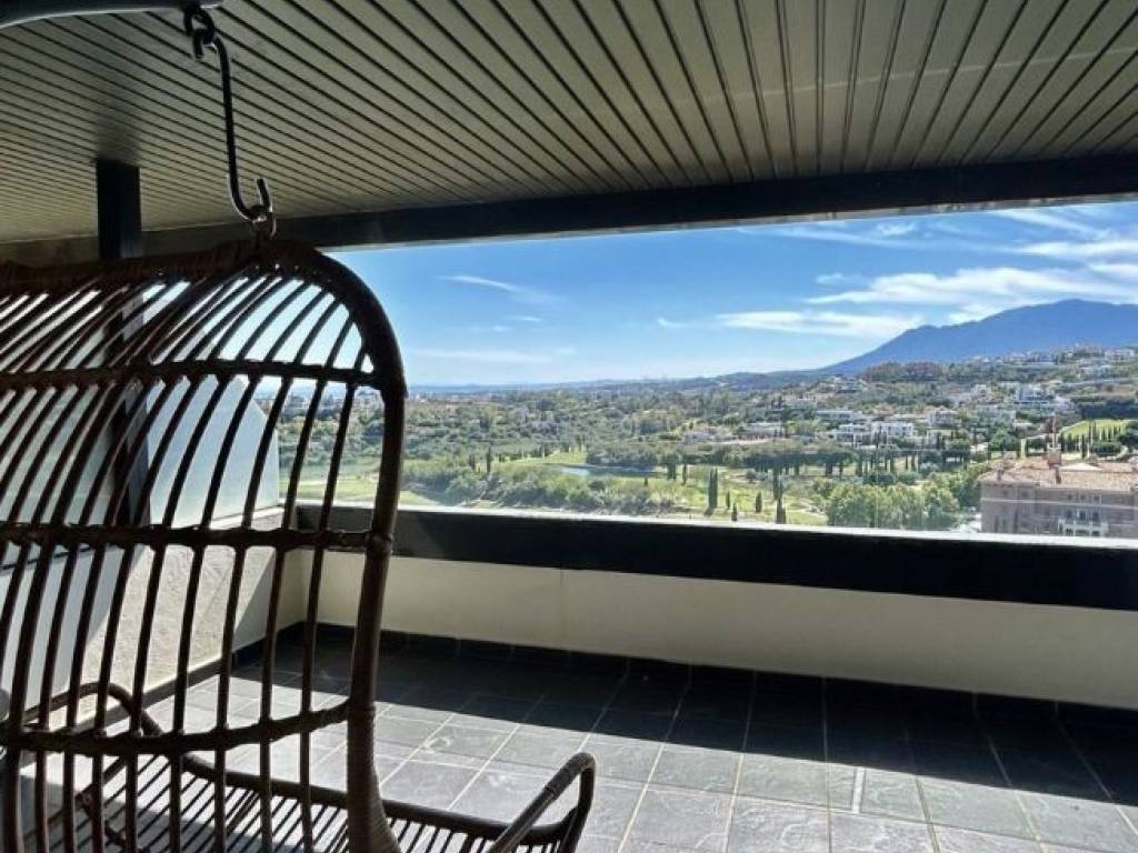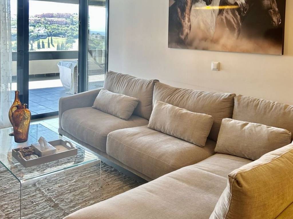 Beautiful apartment for sale in Los Flamingos boasting open sea, golf and lake views. The apartment consists of a living and dining area that go out to a spacious south facing terrace overlooking Villa Padierna, the sea and mountain. The kitchen is fully equipped plus a laundry room. Two bedrooms with built-in wardrobes and two bathrooms, one en-suite. The apartment is sold furnished and comes with underground parking and storage. The complex is gated and very well maintained and has 3 swimming pools settled in a beautiful tropical garden and a putting green as well as concierge service