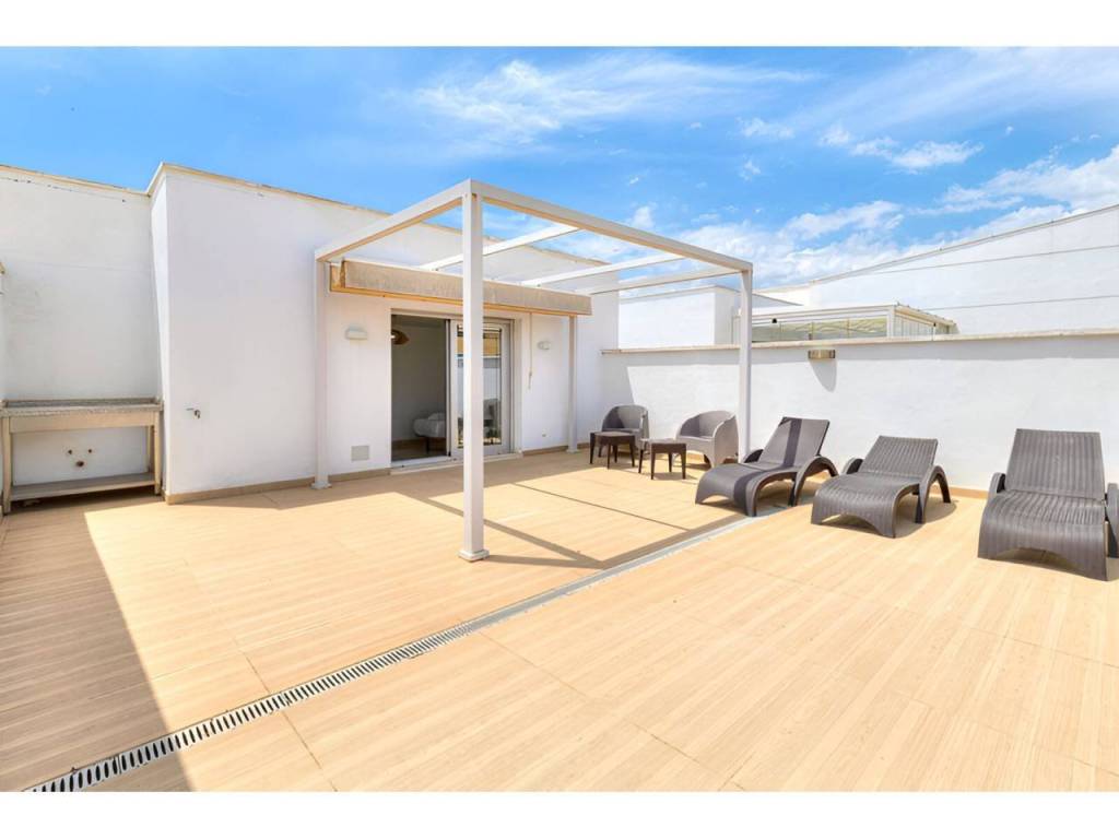 La propiedad cuenta con tres dormitorios, dos baños modernos, cocina totalmente equipada y un salón-comedor con acceso a una terraza privada y un solárium de 81 m², perfectos para comer al aire libre o relajarse al sol.