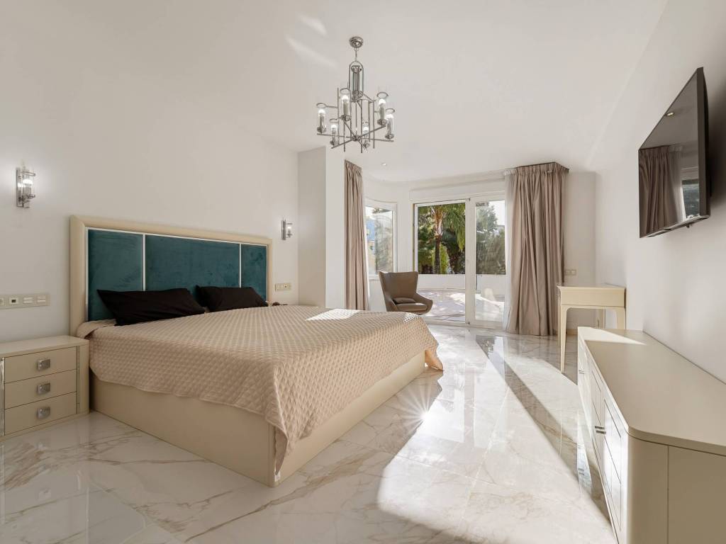 La suite principal se distingue por un vestidor y acceso directo a la terraza, ideal para disfrutar plenamente del entorno único y del clima de la Costa del Sol.