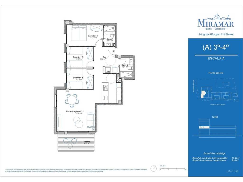 Plano e información sin carácter contractual elaborada a partir del Proyecto Básico presentado para tramitación de la licencia de obras. Información sujeta a modificaciones necesarias por exigencias de orden técnico, jurídico o comercial durante el transcurso de la obra o una vez finalizada la misma, sin que esto implique alteración significativa del objeto y sin menoscabar las calidades de los materiales. Infografías exteriores e interiores meramente ilustrativas y sujetas a posibles modificaciones; mobiliario no incluido; acabados, calidades, colores, equipamiento, aparatos sanitarios y muebles de cocina aproximados. Toda la información y entrega de documentación se hará según lo establecido en el Real Decreto 515/1989 y otras normas que pudieran complementarlo; ya sean de carácter estatal o autonómico.