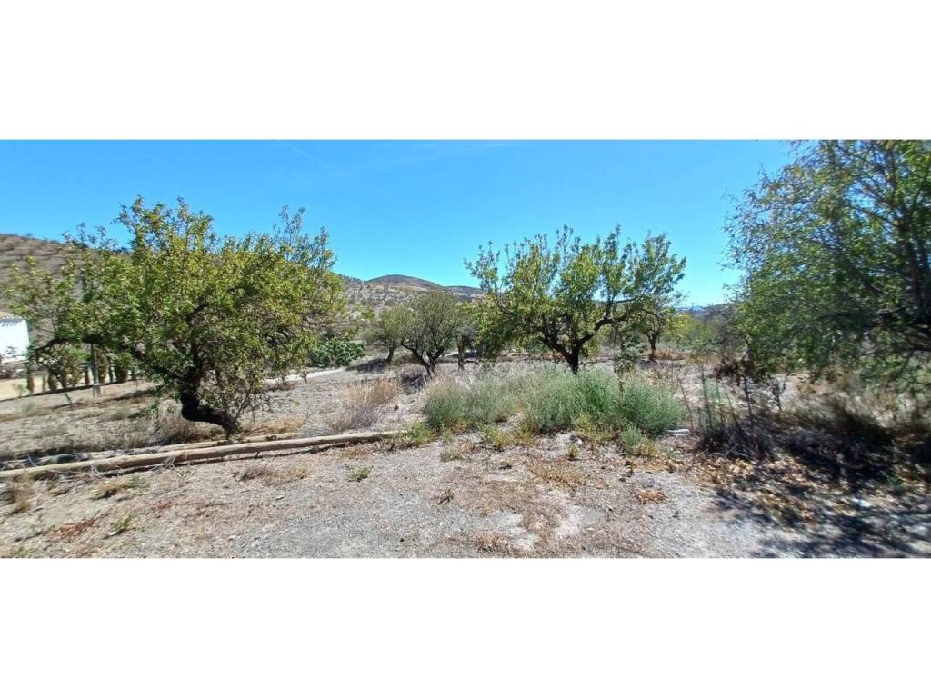 La parcela rústica de 2800 m² está adornada con almendros, olivos y árboles frutales. Con buenas vistas y acceso fácil, además de agua y luz ya conectadas, este cortijo es una excelente opción para quienes buscan un hogar en el campo.
