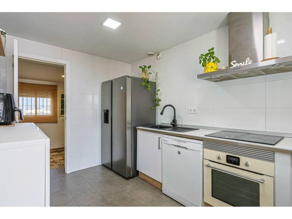 La cocina, moderna y equipada, se integra con el patio trasero ampliado, creando un espacio único para el día a día.