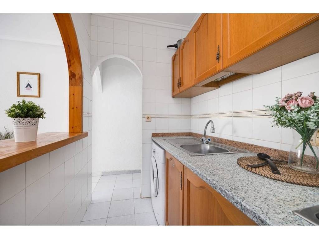 La vivienda cuenta con un luminoso salón que da acceso a una agradable terraza con mesa y sillas, ideal para disfrutar del aire libre. La cocina, de estilo americana, está integrada en el salón, lo que aporta una sensación de amplitud y comodidad.