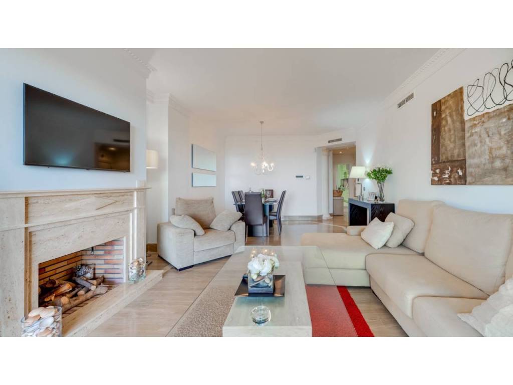 Al acceder a la vivienda, los suelos de mármol y el aire acondicionado integrado reflejan un diseño orientado al confort y la sofisticación. El amplio salón, presidido por una acogedora chimenea, se integra armoniosamente con el comedor, creando un espacio ideal para recibir invitados. Grandes ventanales dan paso a una espaciosa terraza cubierta con zona de estar y comedor exterior, orientada hacia tranquilos jardines y el paisaje mediterráneo, prolongando el interior hacia el exterior.