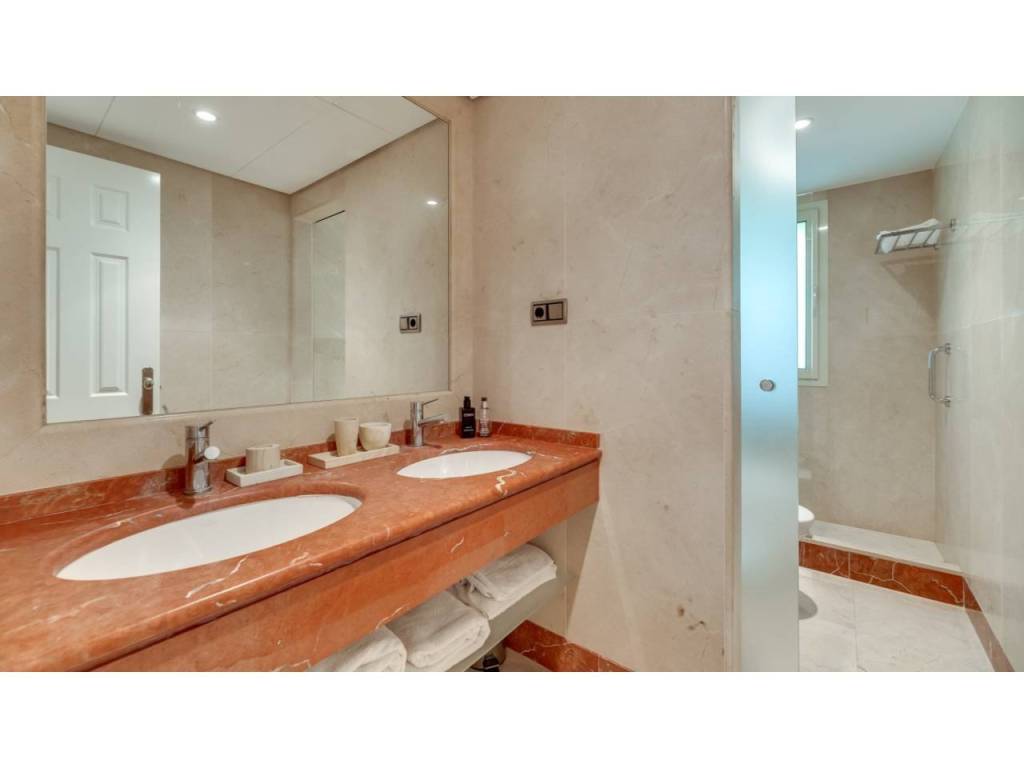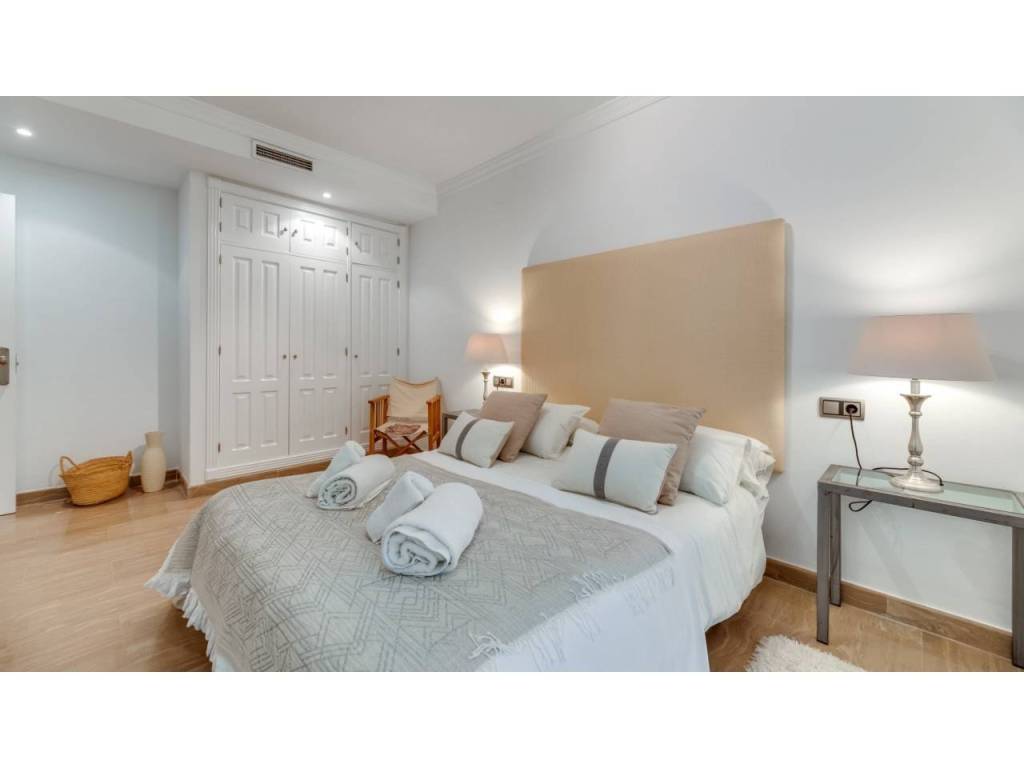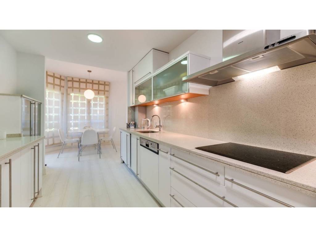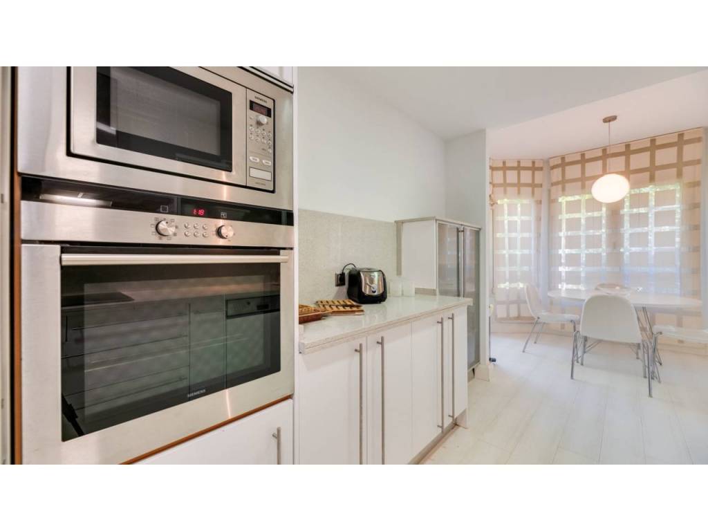 La cocina, completamente equipada, responde a las expectativas más exigentes. La propiedad dispone de tres dormitorios y dos baños, además de un aseo de cortesía. Los armarios empotrados garantizan óptima capacidad de almacenaje y el dormitorio principal cuenta con baño en suite.