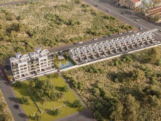 Los exteriores de estas viviendas en Torrevieja están diseñados para complementar el estilo de vida mediterráneo. Cada propiedad cuenta con una terraza, ideal para disfrutar del clima soleado de la región. Además, las viviendas de planta baja ofrecen acceso directo a las zonas ajardinadas, proporcionando un espacio adicional para el ocio al aire libre. Los áticos, por su parte, incluyen un solárium privado, perfecto para tomar el sol en total privacidad. La cercanía al mar, a solo un kilómetro de distancia, permite disfrutar de paseos costeros y actividades acuáticas. La integración de pérgolas en el diseño exterior añade un toque de elegancia y funcionalidad, proporcionando sombra y un espacio acogedor para relajarse.