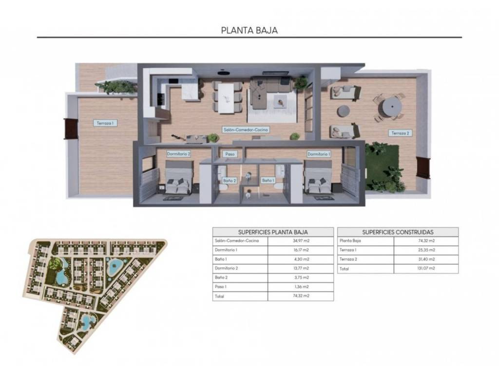 Las viviendas tienen más de 131m2 distribuidos en un amplio salón-comedor con cocina americana, 2 amplios dormitorios y 2 baños completos.