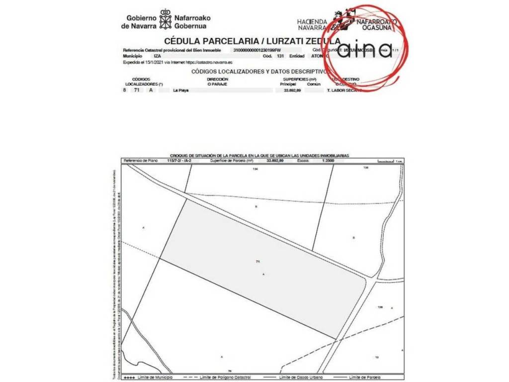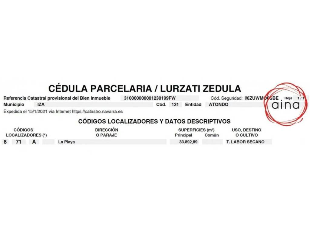 Excelente inversión. Finca de Labor de secano de 38 robadas en Iza, municipio de Atondo, fácil acceso a pie de carretera. Se puede ver la ubicación en las fotos de SITNA o en la Cédula parcelaria. Para mas información no dude en ponerse en contacto con nosotros y le resolveremos cualquier duda.
