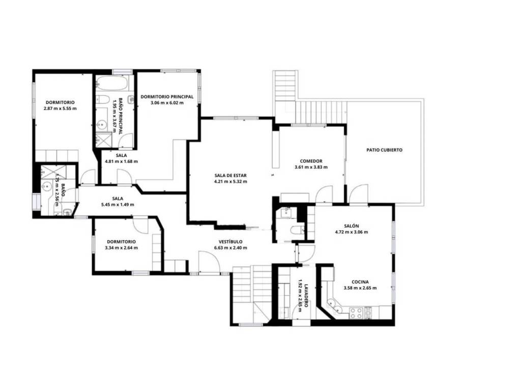 Aquí se encuentra la vivienda principal, compuesta por una amplia cocina, comedor, sala de estar, cuarto de lavado, tres dormitorios dobles —uno de ellos en suite— y tres baños. Todo el nivel destaca por su luminosidad y su cómoda distribución.