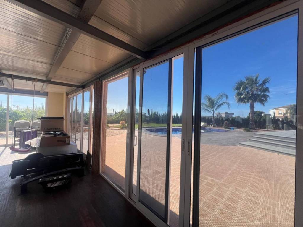 Cómoda parcela pavimentada, con piscina, construcción de 80m2 con grandes ventanales, por lo que es muy luminosa, con barbacoa, cocina con fregadero, baño completo y trastero.