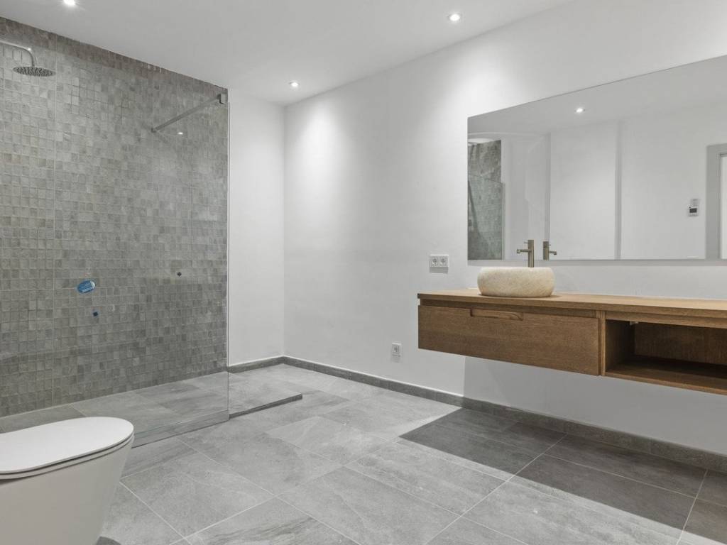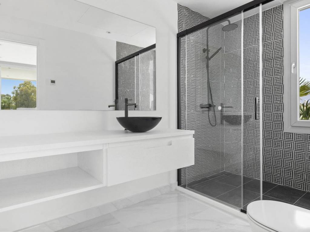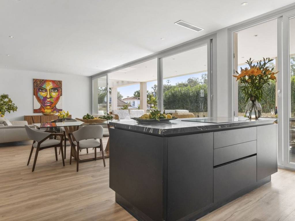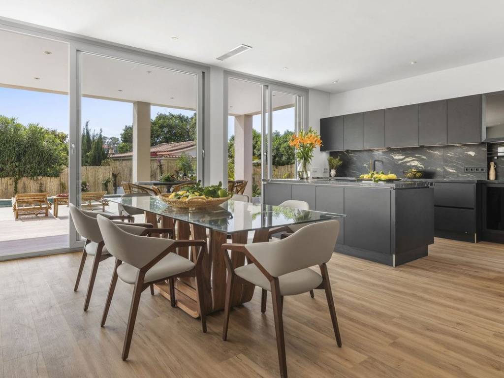 Planta principal: Entrada, salón y comedor con una cocina de concepto abierto totalmente equipada con electrodomésticos Bosch, aseo de invitados y un dormitorio de invitados en suite. Todas las áreas tienen acceso directo a las terrazas cubiertas y abiertas, así como a la piscina privada.