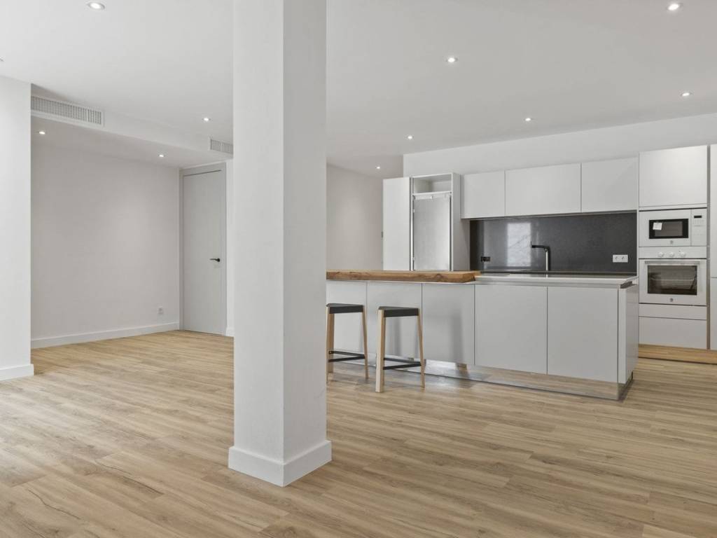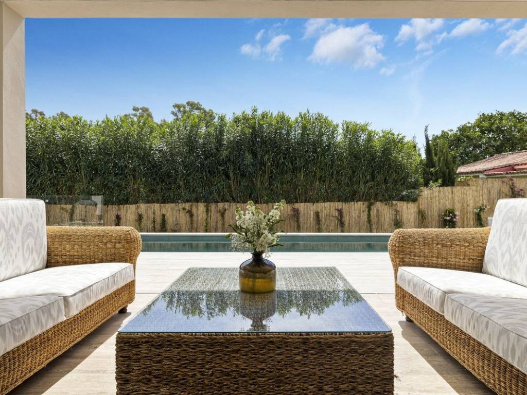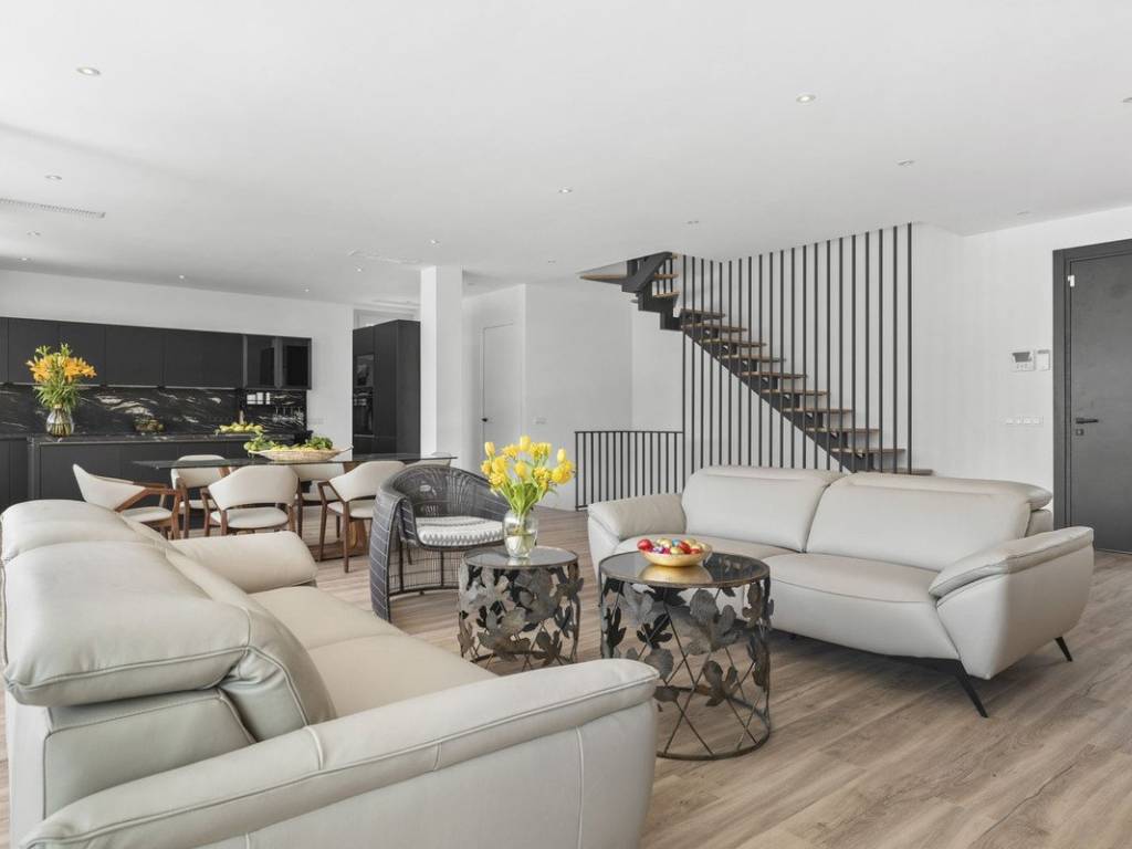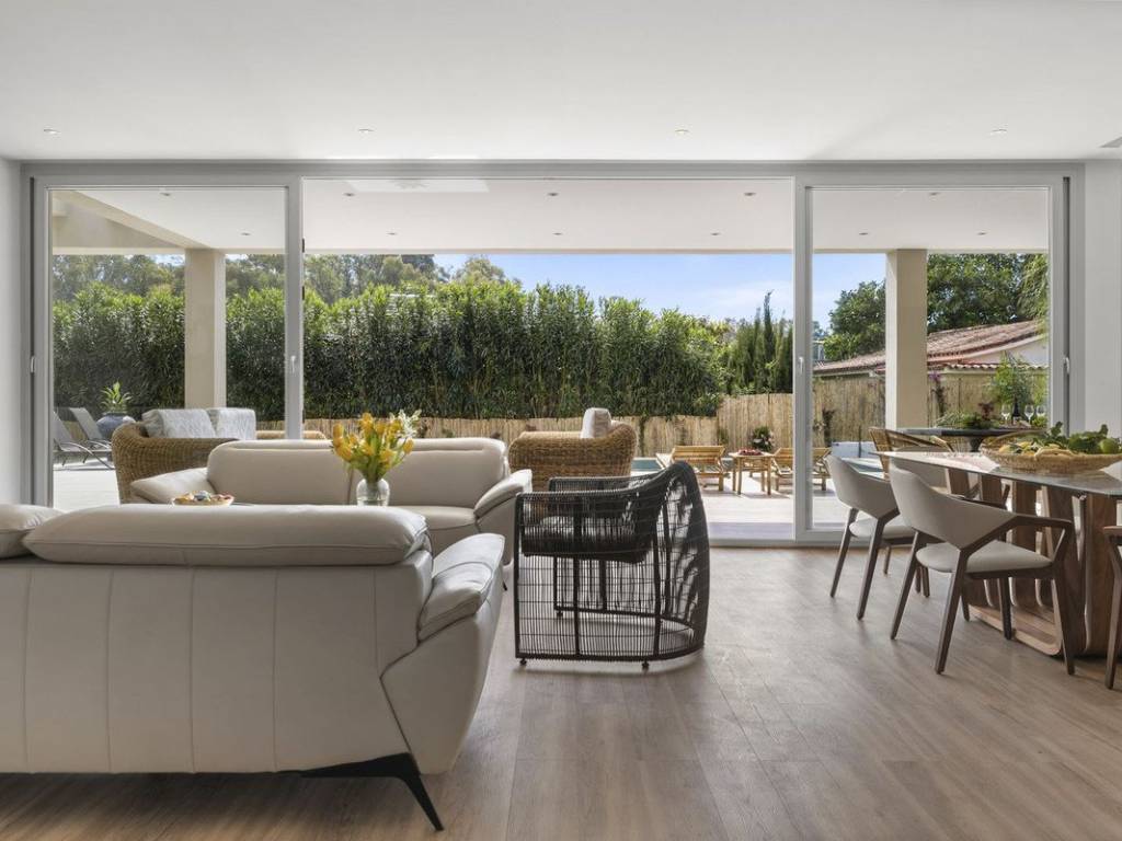 Planta principal: Entrada, salón y comedor con una cocina de concepto abierto totalmente equipada con electrodomésticos Bosch, aseo de invitados y un dormitorio de invitados en suite. Todas las áreas tienen acceso directo a las terrazas cubiertas y abiertas, así como a la piscina privada.