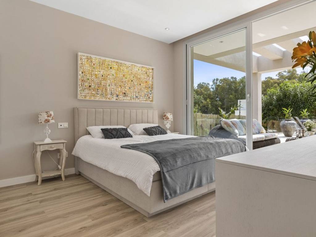 Primera planta: Dormitorio principal con baño en suite y vestidor, además de un dormitorio de invitados en suite. Ambos cuentan con acceso a terrazas privadas.