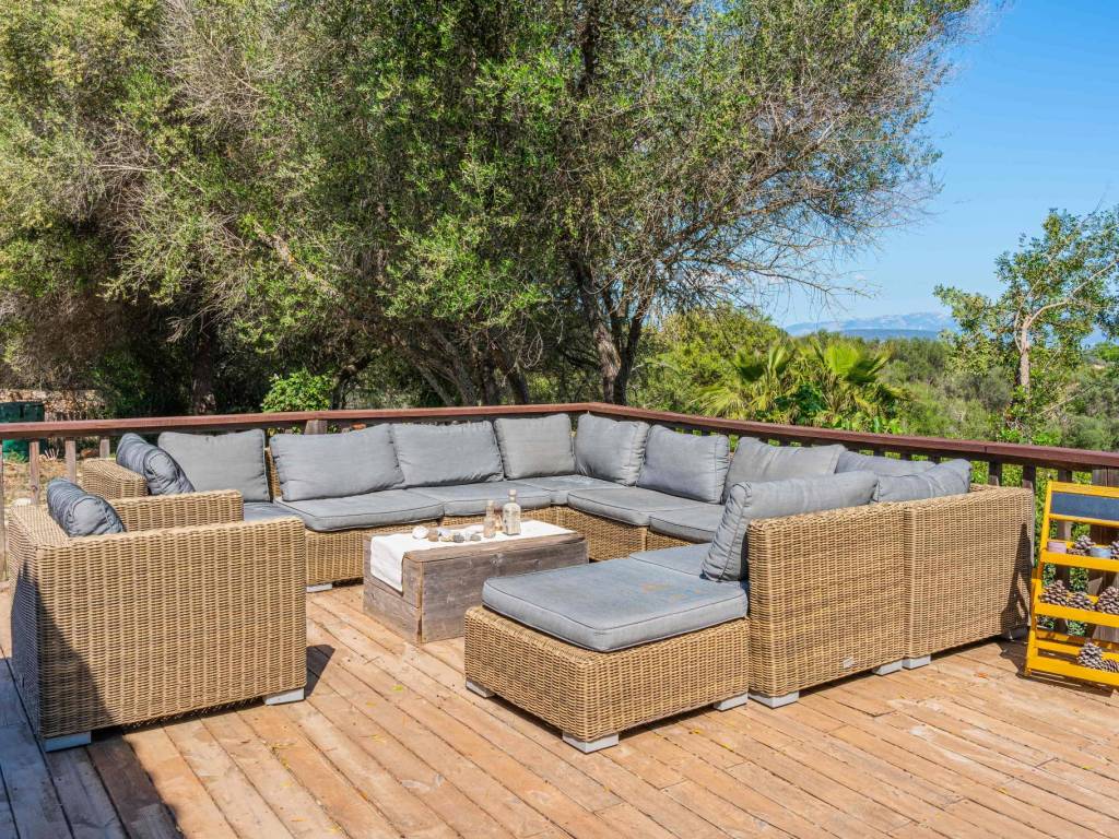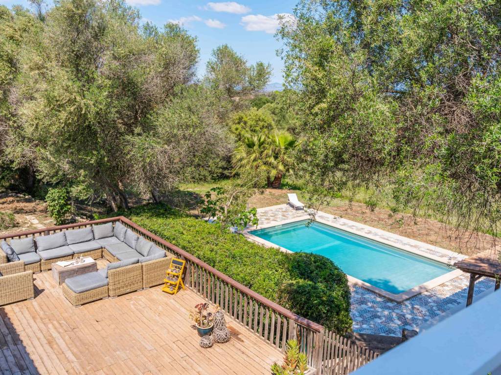 El área exterior impresiona con dos terrazas cubiertas, una amplia tarima de madera ideal como zona de descanso y un aseo independiente junto a la piscina. La entrada destaca por su encanto mediterráneo, con árboles frutales, cipreses, un antiguo olivo y espléndidas buganvillas que decoran con arte la fachada de piedra.