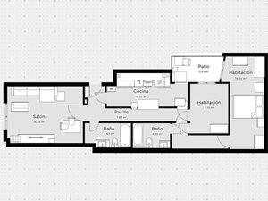 Tiene unas dimensiones de 18,46 m2 con forma alarga con zona para comedor y zona para relax.