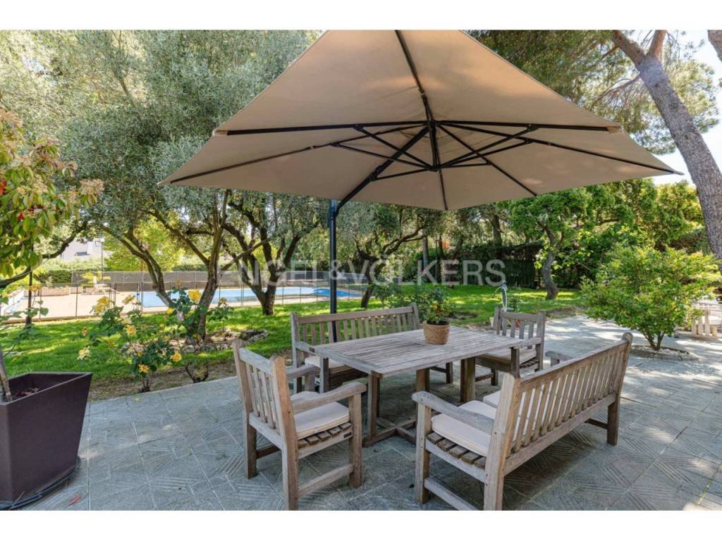 El jardín, muy consolidado, con árboles de gran porte y una piscina privada de 12x6m que garantiza privacidad y disfrute durante todo el año.