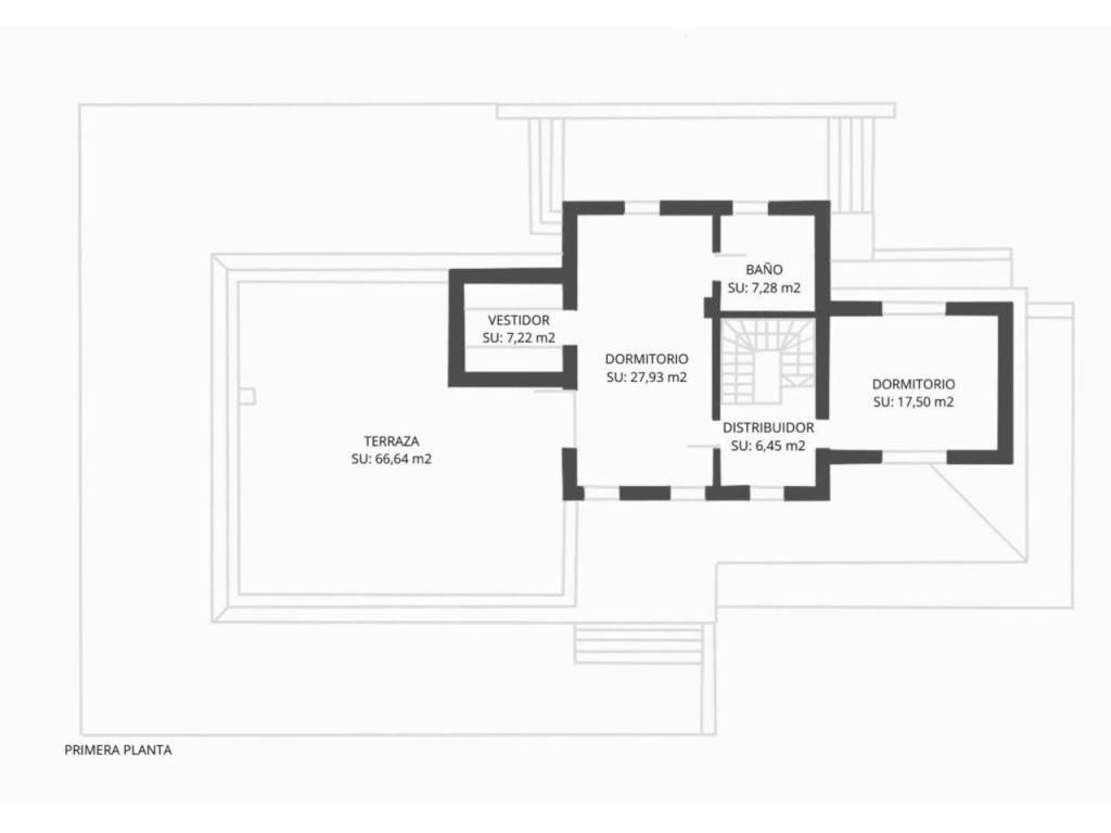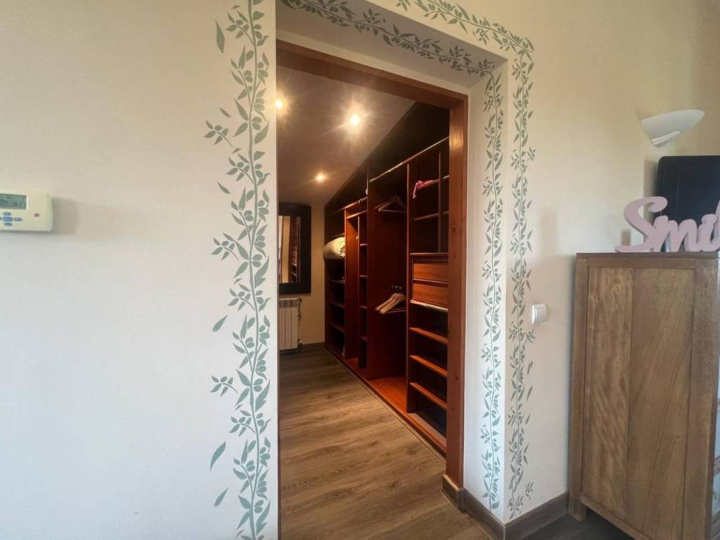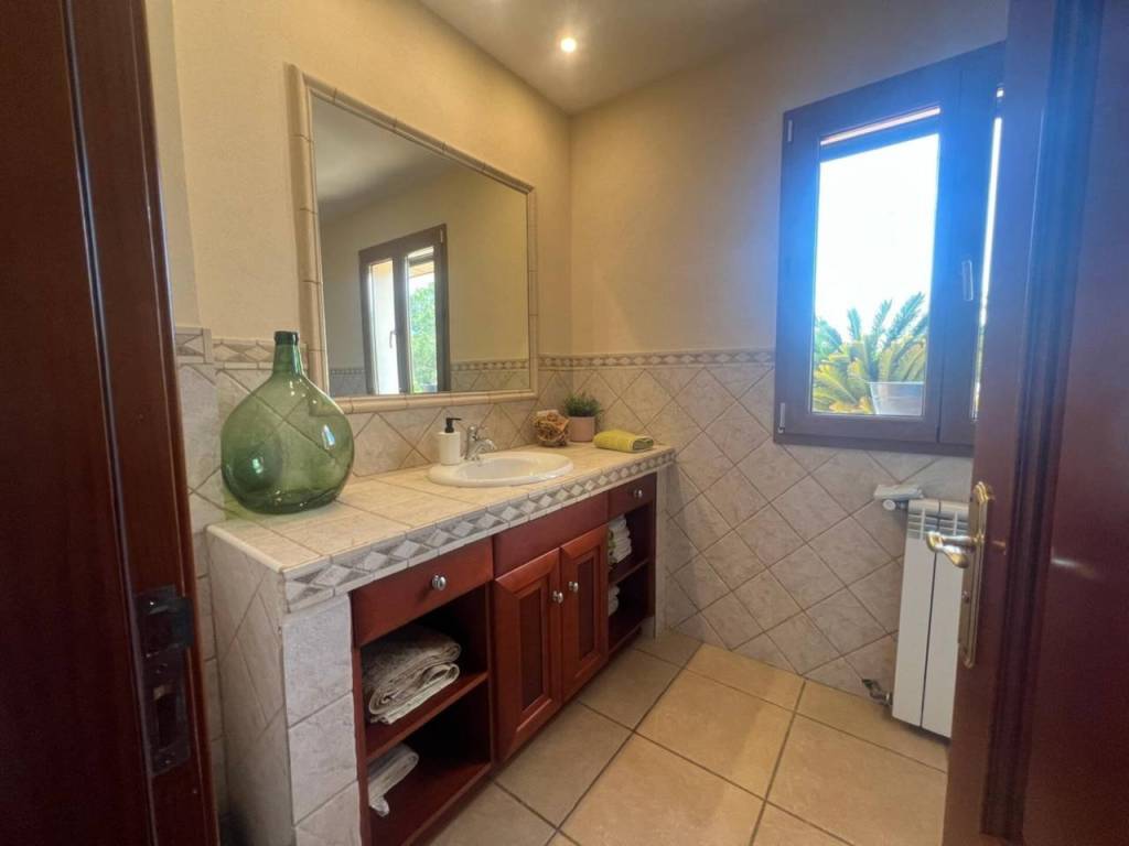 La planta superior alberga otros dos dormitorios, el dormitorio principal con vestidor, baño en suite y salida a una terraza privada con vistas a la Serra de tramontana, el otro destinado a despacho con vigas de madera.