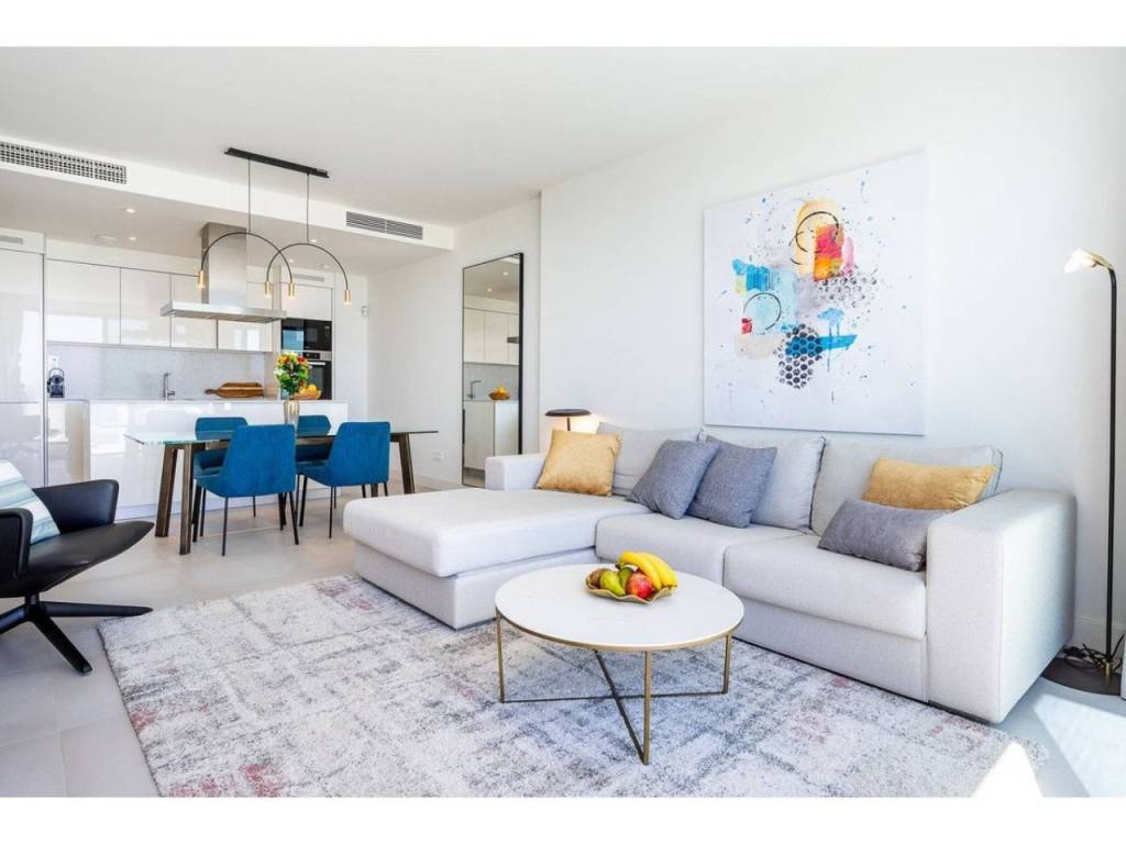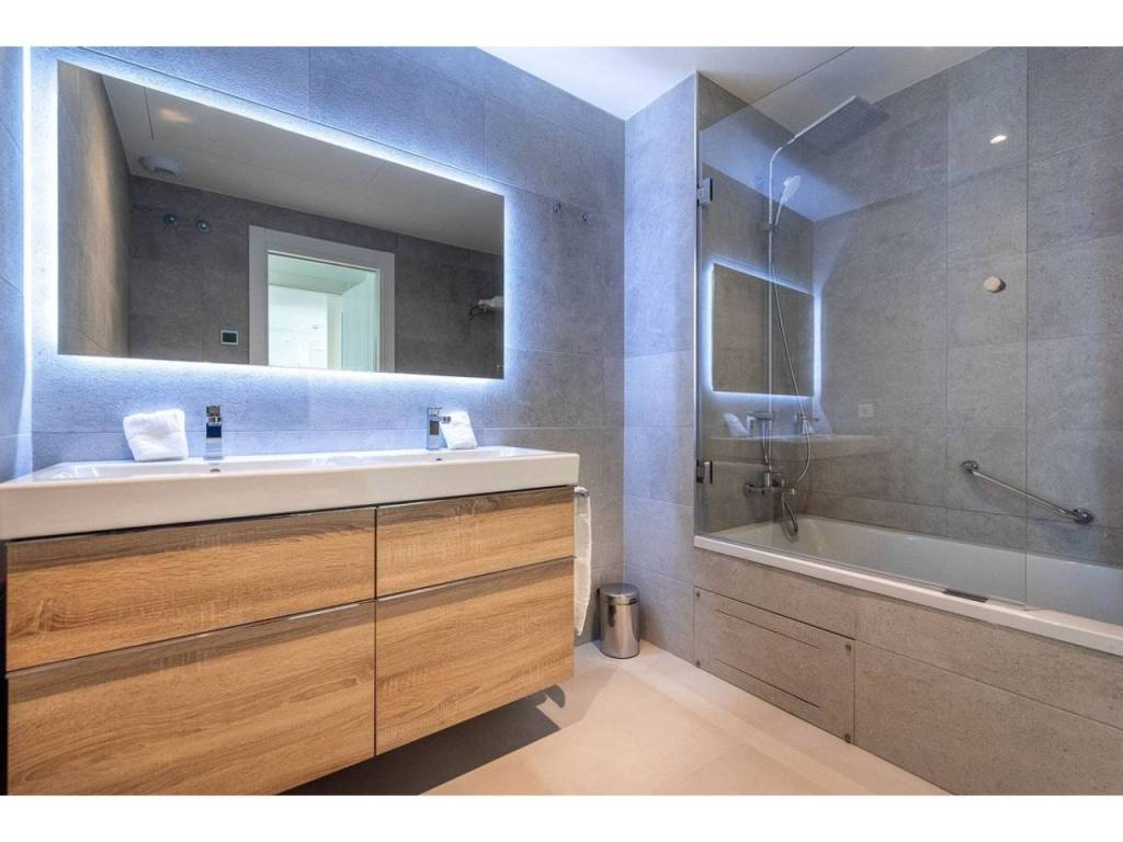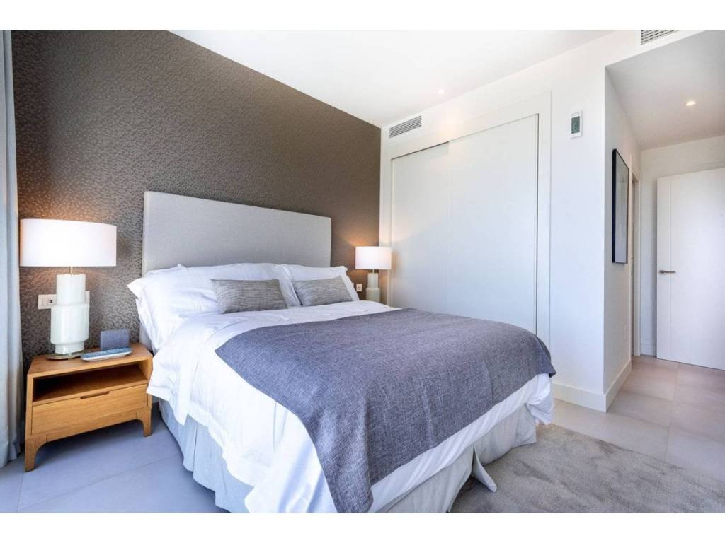 El luminoso y espacioso salón cuenta con grandes ventanales panorámicos que se abren a la terraza orientada al sur y suroeste de 30 m², ofreciendo unas vistas inigualables al mar. La terraza está elegantemente amueblada con una mesa de comedor para seis personas y cuenta con una piscina privada (2x2 m) con paredes de cristal que aportan un toque arquitectónico exclusivo.