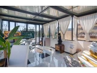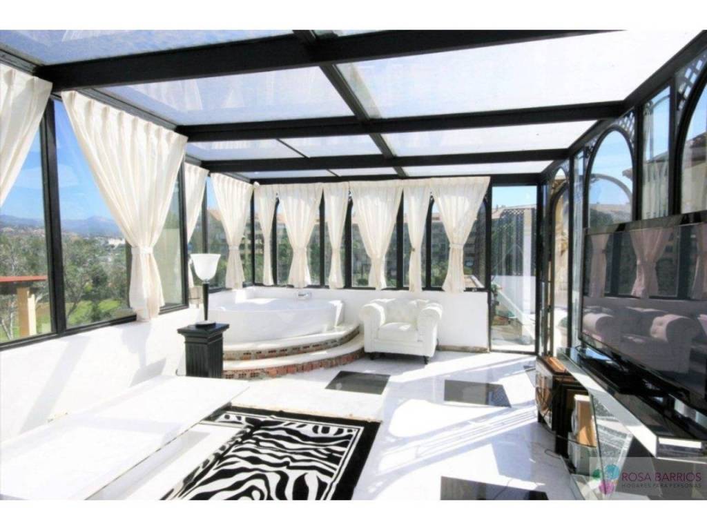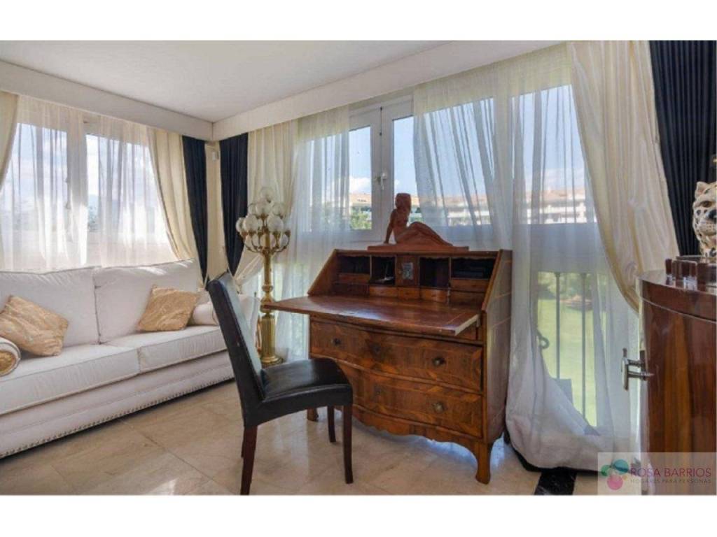 Sofisticado, único y tranquilo apartamento dúplex Art Deco en 1ª Linea de Golf de Guadalmina Alta. La propiedad completamente reformada, se encuentra en un pequeño complejo muy tranquilo y cercano al centro comercial de Guadalmina y ofrece varias opciones. Tiene la posibilidad de transformarlo en 2 apartamentos individuales, ya que dispone de 2 plantas con entradas independientes. En la 1ª planta nos encontramos con un amplio vestíbulo que nos da paso a un luminoso y amplio salón doble, con un comedor, ademas de otro salón privado junto a la cocina la cual se encuentra completamente renovada con hermosas vistas al campo de golf y los jardines tropicales de los que dispone el complejo, y donde podría igualmente disfrutar junto a su piscina. Dispone de dormitorio principal en suite con su propia terraza, mas otra habitación y baño. También tiene una preciosa escalera Art Deco que conduce desde el comedor a una sala acristalada exquisitamente diseñado con jacuzzi con impresionantes vistas donde podrá construir un dormitorio de ensueño o salón para diferentes usos. Este a su vez conduce a un solárium de unos 65m2 con una elegante y sofisticada piscina privada. La propiedad también incluye trastero y garaje.