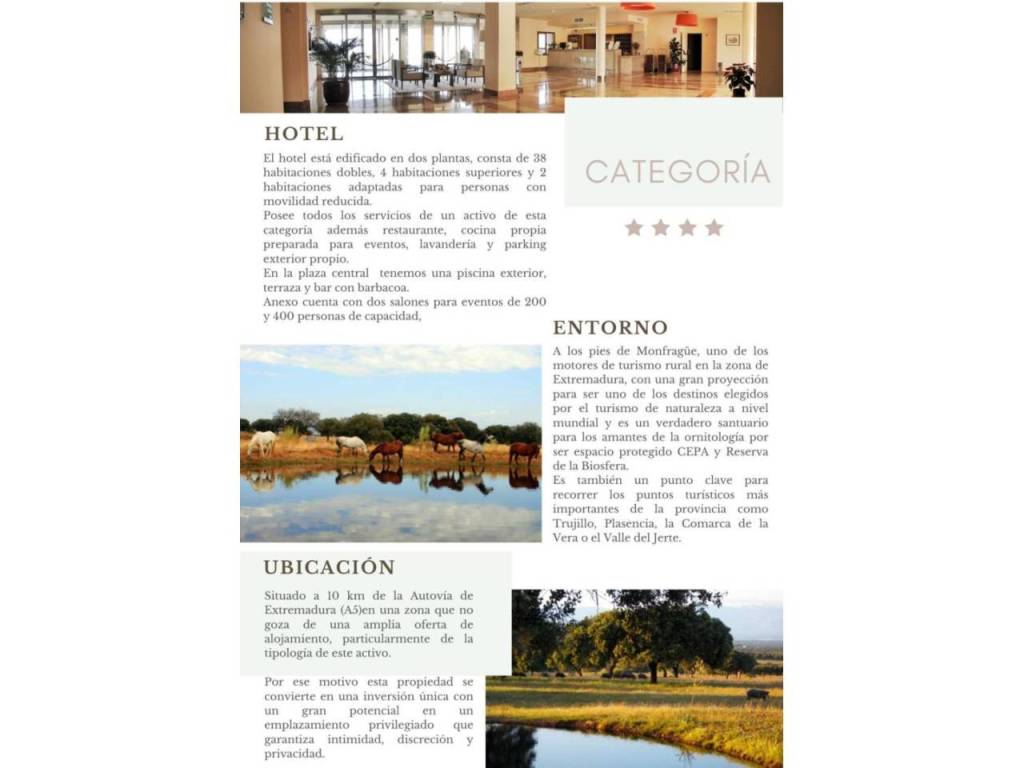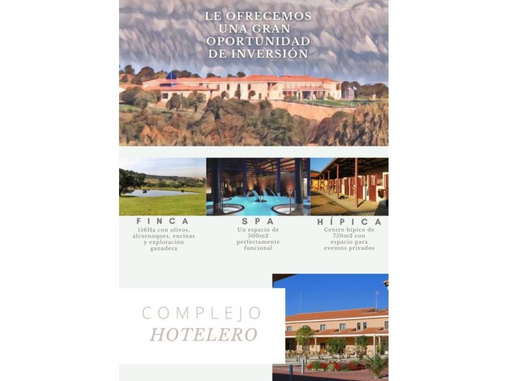 ¿ESTÁ BUSCANDO INVERTIR EN EL SECTOR HOTELERO? ESTA ES SU OPORTUNIDAD. Este complejo privilegiado se encuentra a las puertas del Parque Nacional de Monfragüe, con vistas al campo Arañuelo, en la comarca de la Vera y con el fondo incomparable de la Sierra de Gredos Dentro de una finca de 156Ha encontramos un magnifico hotel de categoría cuatro estrellas con 44 habitaciones, y preparado para personas con movilidad reducida, un balneario-spa totalmente funcional y un centro hípico con instalaciones propias Dentro de los servicios de los que dispone el hotel tenemos una piscina exterior, lavandería, aparcamiento, varios salones y salas de reuniones y un edificio anexo donde se pueden celebrar todo tipo de eventos en la mayor intimidad. La finca privada donde se levanta este complejo está rodeado por 22.000 olivos con riego por goteo, encinas y alcornoques por donde pasear libremente, posee agua propia (3 pozos. 9 charcas naturales y 5 depósitos) además de naves e instalaciones preparadas para las explotaciones ganaderas de cerdo ibérico y oveja (300 y 350 cabezas aproximadas respectivamente) con las que cuenta. Siendo un espacio único para observar la fauna y flora autóctona, esta propiedad singular puede visitarse para conocer todas las posibilidades que brinda. Si necesita más información o quiere visitarlo, no dude en ponerse en contacto con nosotros o visitar nuestra página web www.calibe.es. CALIBE ASESORES INMOBILIARIOS se pone a su disposición para visitarlo y asesorarle en lo que necesite.