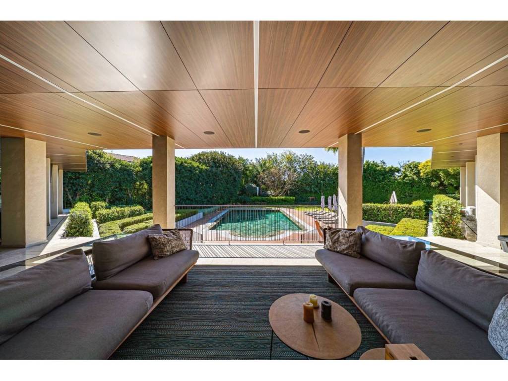 El exterior está igualmente cuidado: una piscina desbordante con solárium de madera, áreas de descanso con hamacas, jardines meticulosamente diseñados y varias terrazas con orientación sur garantizan luz natural durante todo el día y puestas de sol inigualables sobre el campo.