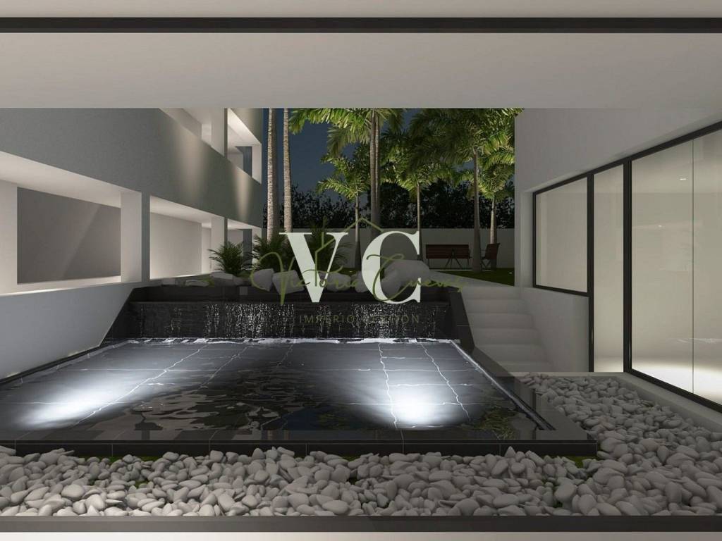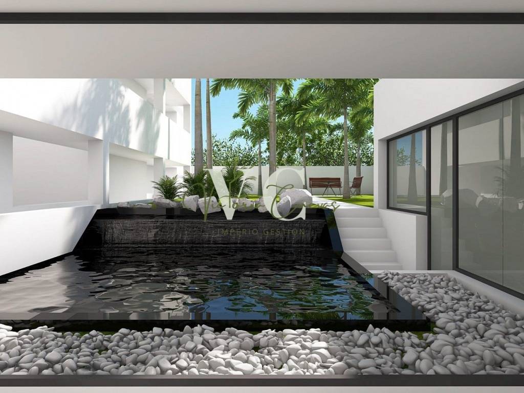 Jardín Zen con lámina de agua y zona de relax -esparcimiento en zonas comunes.