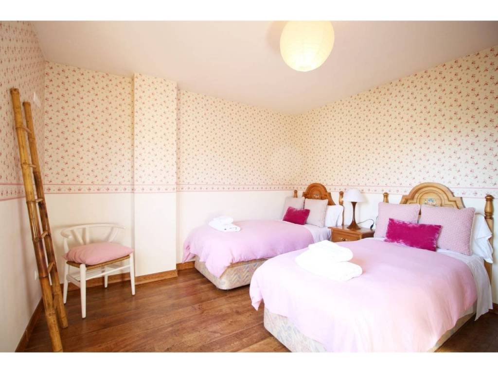 En el salón existe una escalera que da acceso a la planta superior donde hay cuatro habitaciones, tres de ellas perfectamente equipadas y una cerrada ya que la propiedad no la utiliza para el negocio.