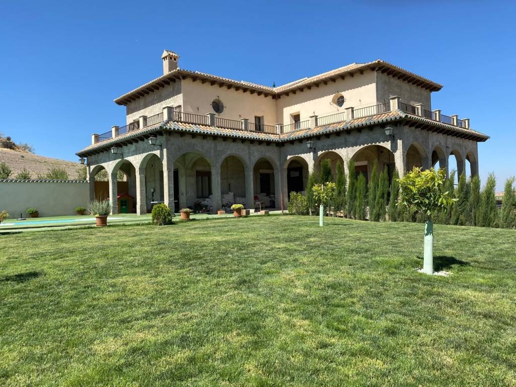 Dentro de la finca encontramos un casa principal de dos plantas distribuida en un gran salón-comedor con chimenea y diseño de dos alturas, 5 amplios dormitorios con baño en suite, biblioteca o sala para diferentes usos, amplia cocina desde la que se accede al porche que rodea toda la vivienda.