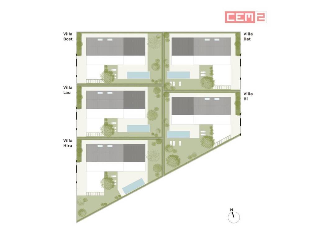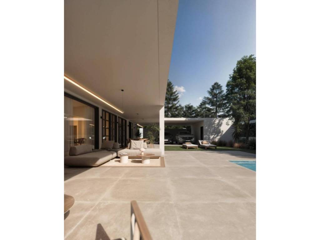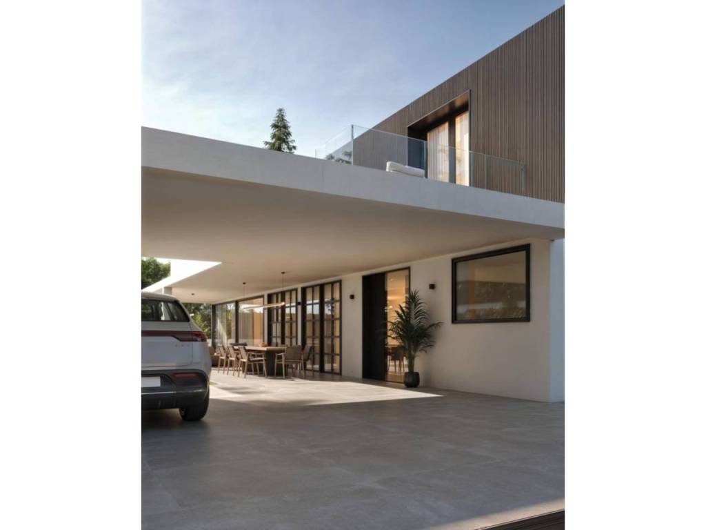 La parcela cuenta con varias zonas pavimentadas para facilitar tanto el acceso como su utilización y disfrute. Así, cada villa cuenta con dos porches, uno de acceso y otro el propio de la vivienda, una zona de solarium, con posibilidad de instalar una piscina (opcional), y otra de aparcamiento con capacidad para tres vehículos disponibles, una zona de garaje está cerrada mientras las otras dos quedan cubiertas.
