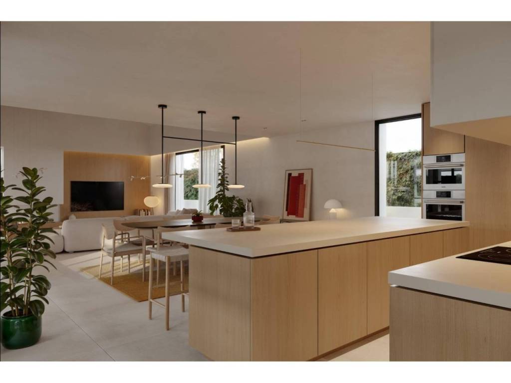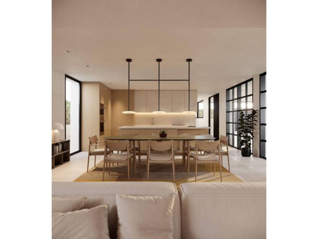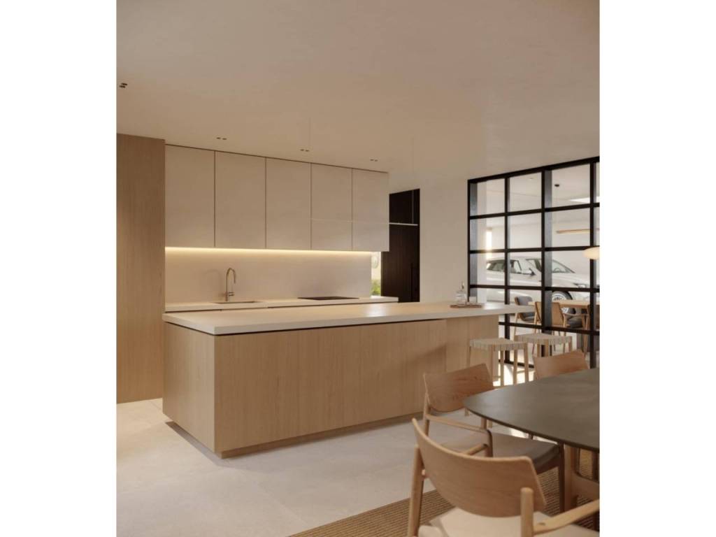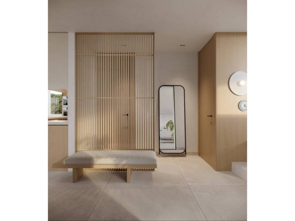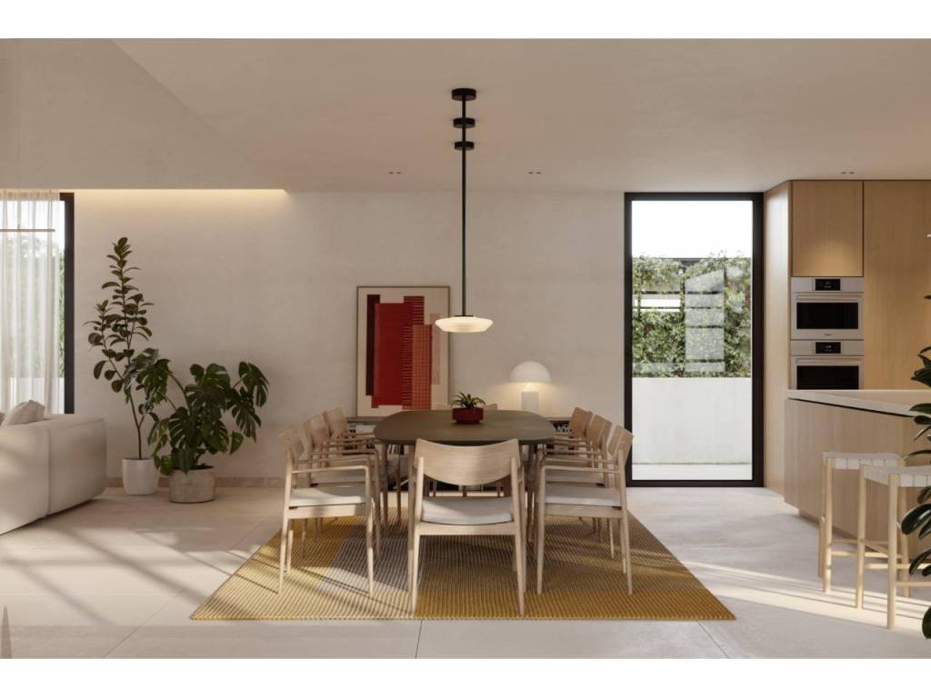 Un acogedor hall de entrada da la bienvenida a un espacioso y luminoso salón-comedor con cocina americana, concebido en concepto abierto y con acceso directo al jardín mediante grandes ventanales, que aportan luz natural durante todo el día. En esta planta también se encuentra un baño, el cuarto de lavandería y un dormitorio o estudio, como espacio polivalente, ideal para mayor comodidad y accesibilidad.