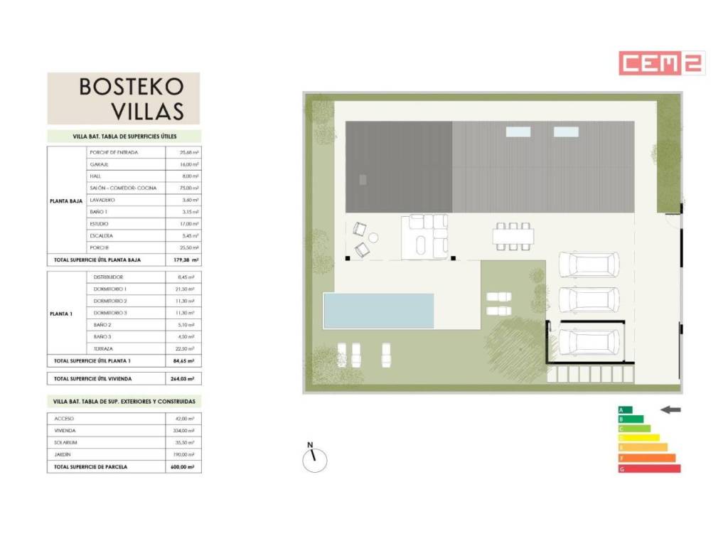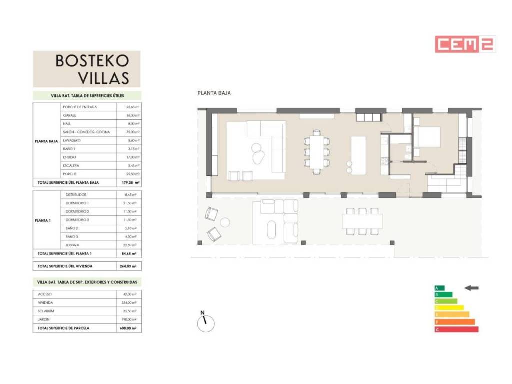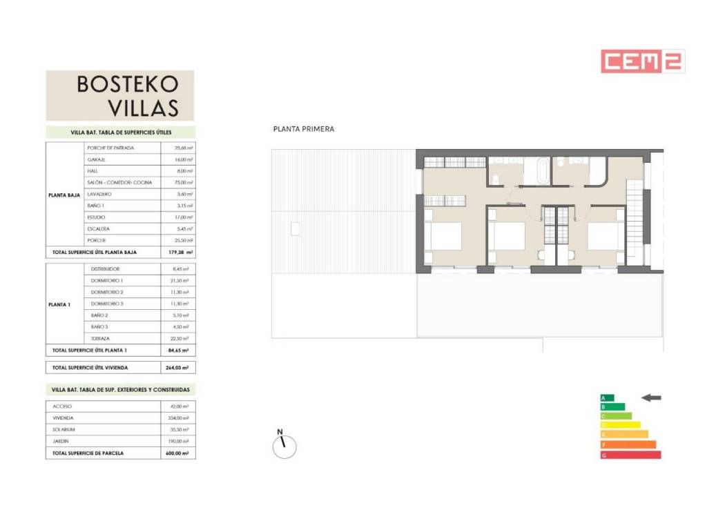 La villa cuenta con una superficie construida de 334 m2 y una superficie libre resultante en la parcela es de 335 m2. Esta vivienda destaca por su diseño moderno y estándares constructivos, así como materiales de calidad y máxima eficiencia energética, que se conseguirá mediante un alto grado de aislamiento térmico, carpinterías exteriores de calidad y el sistema de climatización más eficiente que existe actualmente, la aerotermia, que provee tanto de frío como de calor mediante suelo radiante, para tu máximo confort y el de tu familia e invitados.