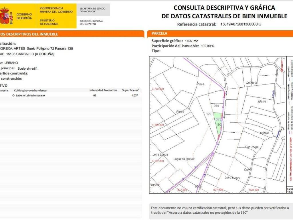 Desde Blancocasa disponemos a la venta este solar urbano ubicado en el Lugar de A Igrexa, parroquia de Artes, Carballo (A Coruña). Superficie total: 1.037 m2 Clasificación: Suelo urbano en su totalidad Suministros disponibles: conexión a agua y luz Cerrado en todo su perímetro Cuenta con árboles frutales Incluye un pequeño almacén Ubicación privilegiada: A tan solo 3,5 km de Carballo A 450 metros de la Escuela de Artes A 12 km de la playa Precio: 55.000 - Este precio no incluye ningún tipo de Impuesto, ni gastos de Notaría ni de Registro. Este terreno se encuentra en una zona poco poblada, lo que te permitirá beneficiarte de reducciones fiscales en los impuestos de la compra.Lo vemos? Más info y visitas: 604020367 - 881948196 blancocasa.net La información aquí contenida ha sido facilitada por terceros y se considera fiable, aunque no vinculante ni contractual. La oferta puede estar sujeta a cambios de precio o disponibilidad sin previo aviso.