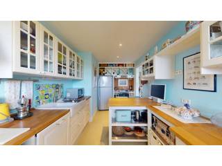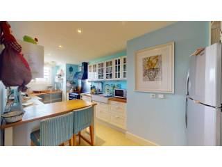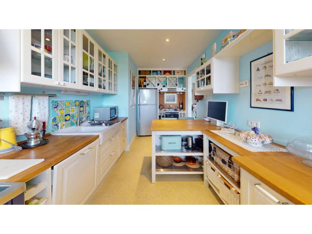La cocina, muy luminosa y de generosas dimensiones, está completamente equipada con electrodomésticos modernos y una práctica zona de almacenaje.