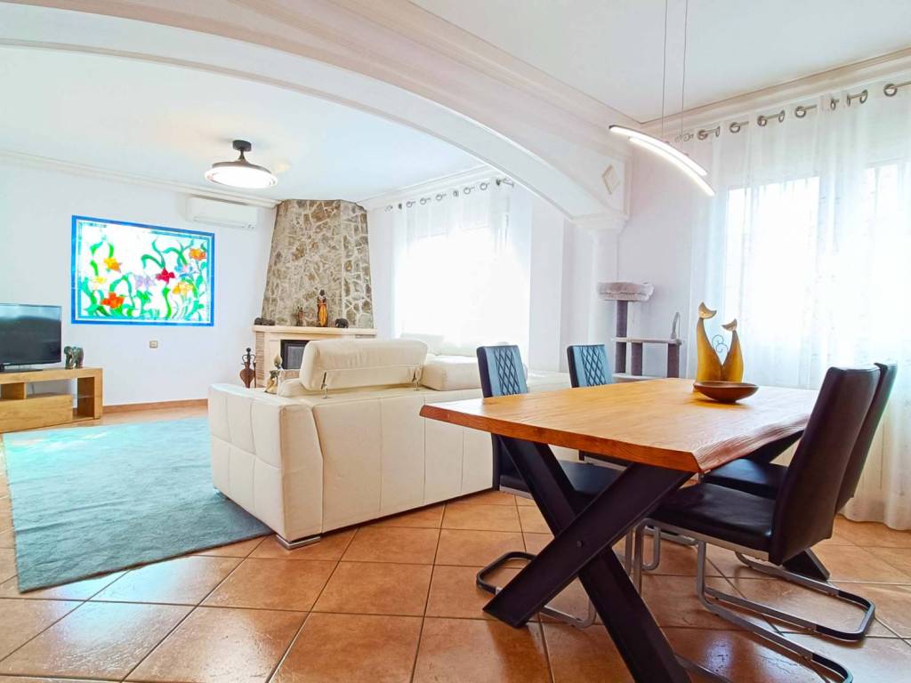Comedor con aire acondicionado y chimenea de leña ventilada.
