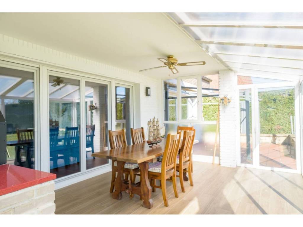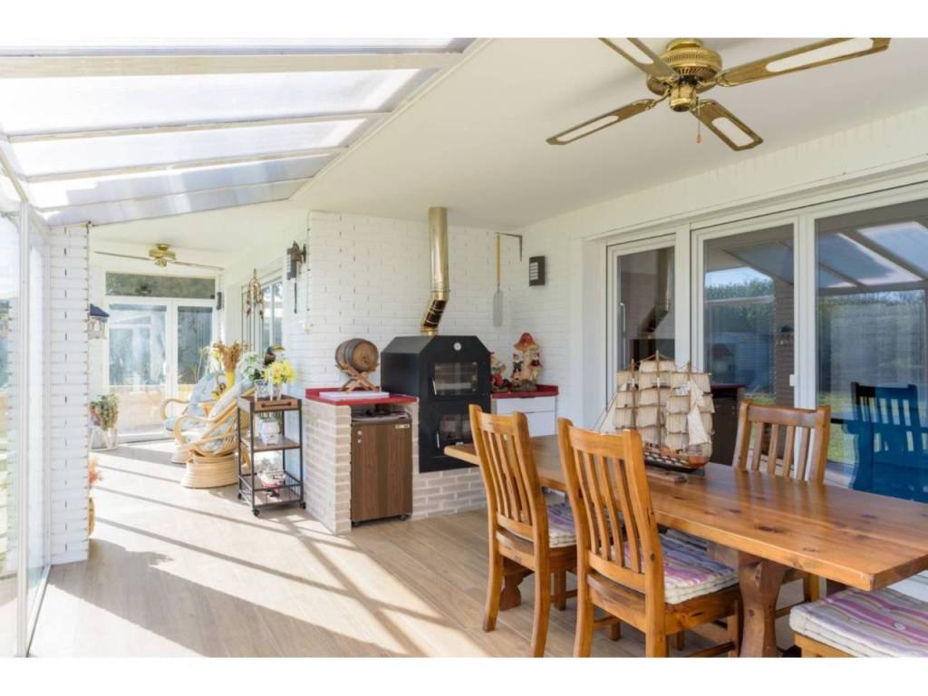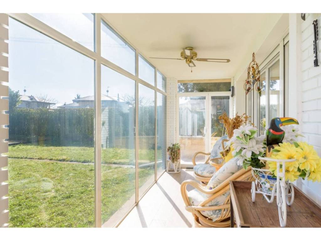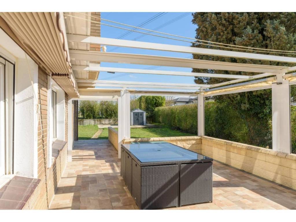 Porche de entrada acristalado, otro gran porche en la fachada sur con toldos y una terraza en la primera planta.