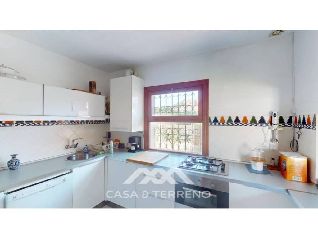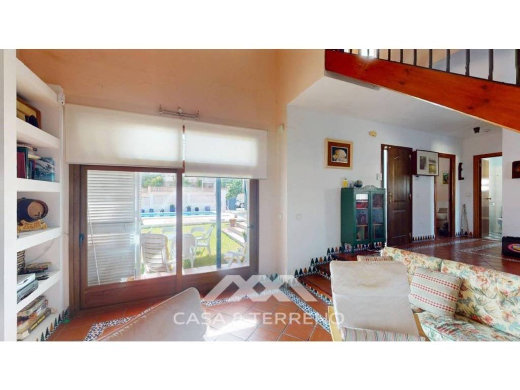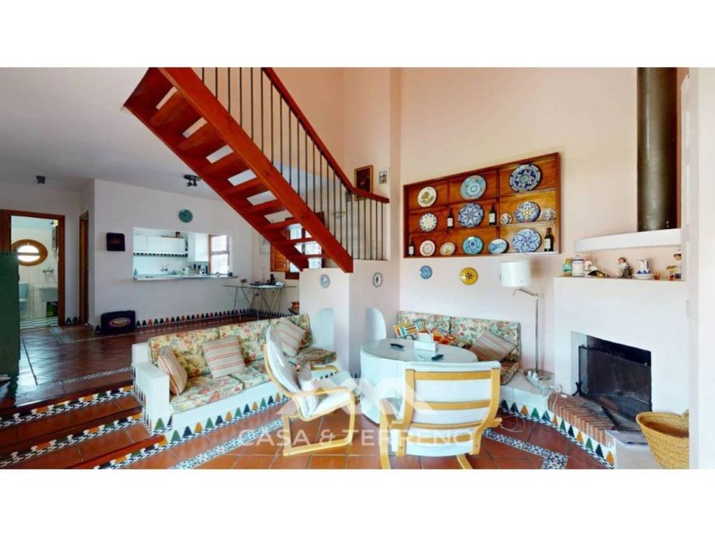 Su diseño inspirado en el Mediterráneo se refleja en los suelos de baldosas de terracota, la calidez de la madera y los espacios luminosos y aireados. El salón dispone de un original diseño en dos niveles con cenefas decorativas, acogedora chimenea y estanterías empotradas que aportan estilo y funcionalidad. Una elegante escalera de madera conduce a la planta superior, mientras que la cocina de planta abierta se conecta perfectamente con el salón, creando un espacio ideal para la vida familiar o recibir invitados.