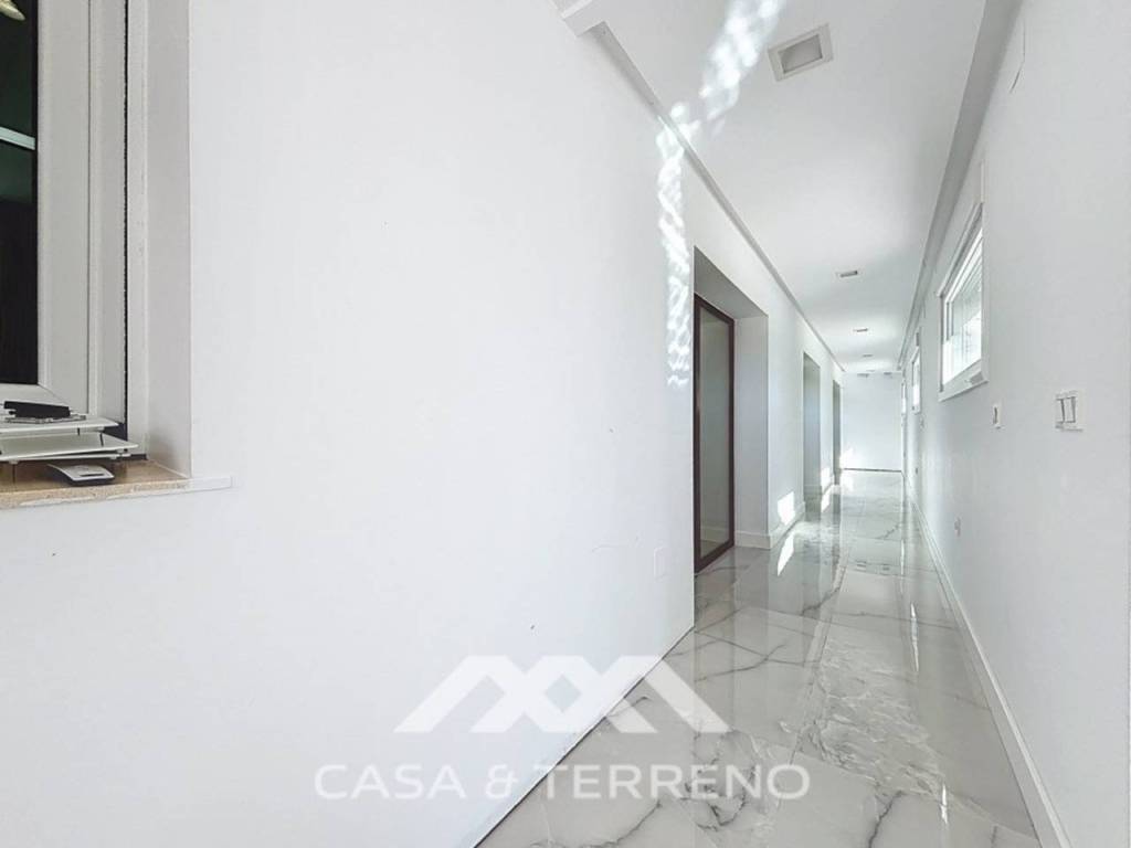 La vivienda principal se distribuye en dos plantas, cada una con entrada independiente. En la planta baja, completamente renovada con un estilo moderno, encontramos 4 dormitorios, 3 de ellos con baño en suite (actualmente por terminar), una oficina, un baño completo, un aseo, un amplio salón y una cocina funcional.
