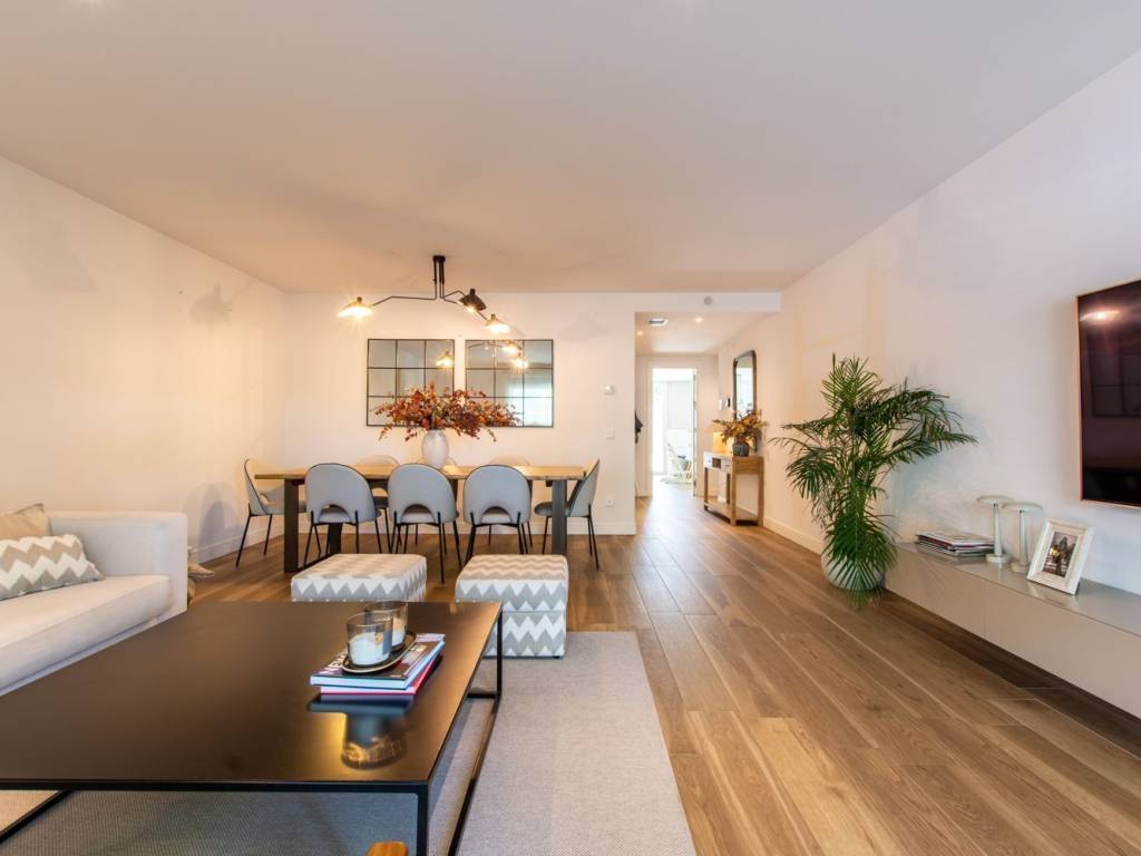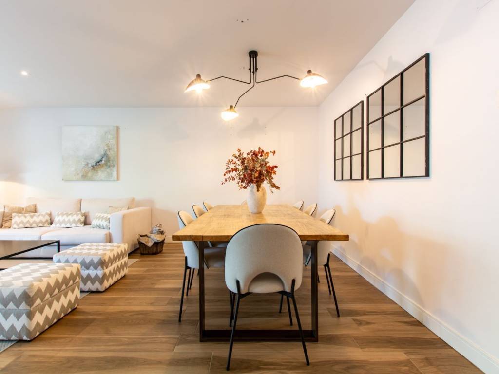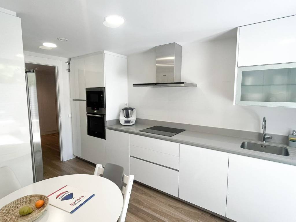 El gran salón comedor tiene salida directa a porche de la terraza a través de un gran ventanal corredero de marca cortizo, como el resto de carpintería exterior de la casa. La cocina comedor está equipada y cuenta con una terraza aneja destinada a zona de lavado. Desde la cocina accedemos a la parte de la terraza que da a la otra fachada. Junto a la cocina hay un gran aseo de cortesía con espacio suficiente para incluir una bañera o plato de ducha y hacer un 3 baño completo a la vivienda.