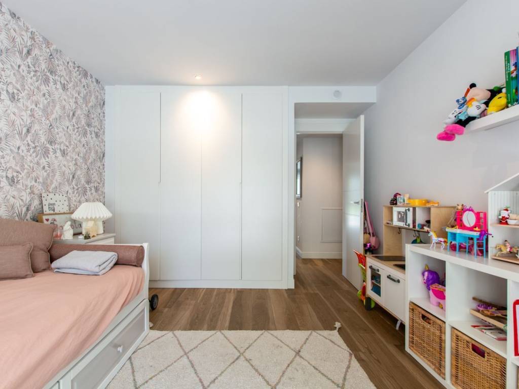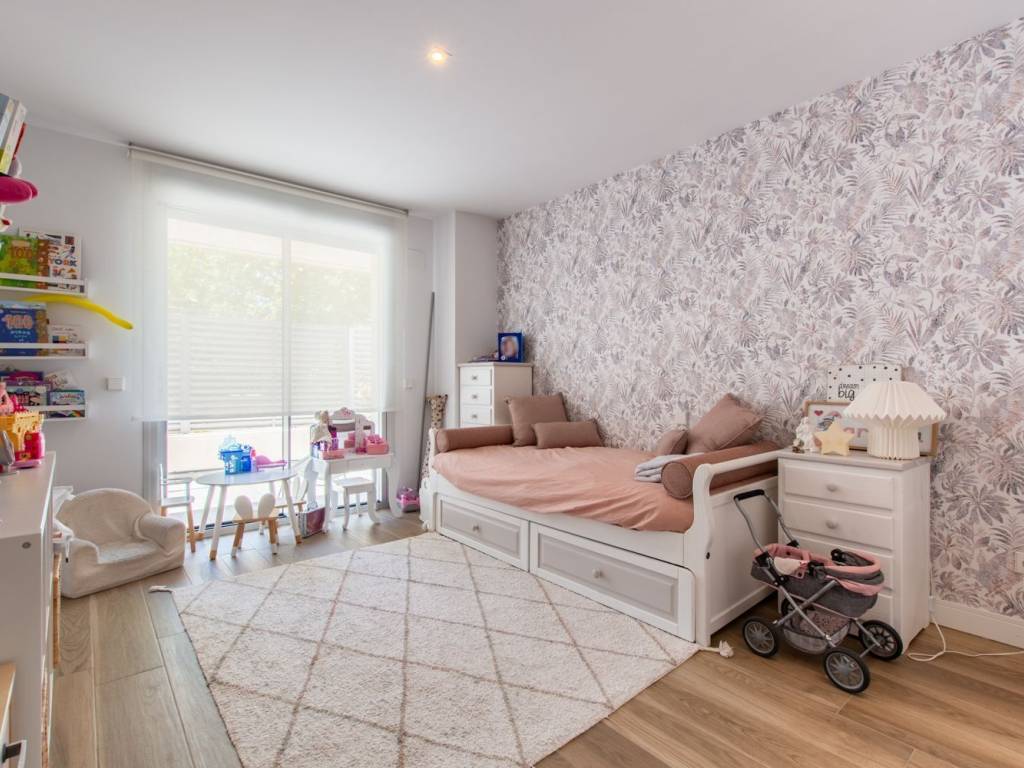 El área destinado a dormitorios se encuentra separado por una puerta para dotar de privacidad a ese ala. La primera habitación a la izquierda, actual dormitorio infantil, recibe mucha luz de mañana y tiene gran armario empotrado, junto a este hay una baño completo con bañera que da servicio también a otro dormitorio, actual despacho. El dormitorio principal en suite cuenta con un vestidor a la entrada con toda la pared lleno de armarios empotrados y el dormitorio tiene salida directa a la terraza que conecta toda la casa. El baño de este, cuenta con plato de ducha.