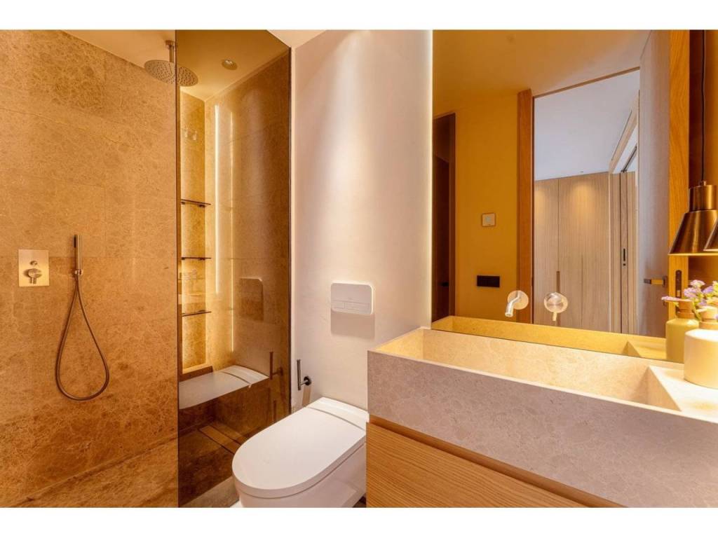 Una escalera interior conduce a la planta superior, donde se encuentra la suite principal, que ofrece una sensación de privacidad y serenidad con acceso directo a la terraza a través de un balcón francés. Los baños están equipados con accesorios y acabados contemporáneos, manteniendo un estilo cohesivo y lujoso en todo el apartamento.