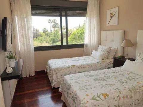 Este espectacular apartamento dúplex es perfecto tanto para golfistas como para familias que buscan un entorno exclusivo y tranquilo. Con 130 m² construidos y 110 m² útiles, este piso ofrece un salón-comedor orientado al sur que se abre a una terraza con jardín privado, ideal para disfrutar del clima mediterráneo. La cocina, completamente equipada, cuenta con una cómoda mesa de desayuno. En la planta superior, encontrarás dos amplios dormitorios con vistas impresionantes al jardín y al mar, además de dos baños completos que garantizan el máximo confort. Los suelos de madera y los muebles modernos crean un ambiente acogedor y elegante. Cada dormitorio está equipado con aire acondicionado y televisión para tu comodidad. La comunidad ofrece servicios de lujo como sauna, jardín y una zona de piscina con vistas al campo de golf. El alquiler incluye electricidad, agua y Wifi, y está disponible hasta finales de junio de 2024. Además, cuenta con armarios empotrados, trastero y ascensor. No pierdas la oportunidad de vivir en un lugar donde la comodidad y el estilo se combinan a la perfección. ¡Contacta ya para más información!