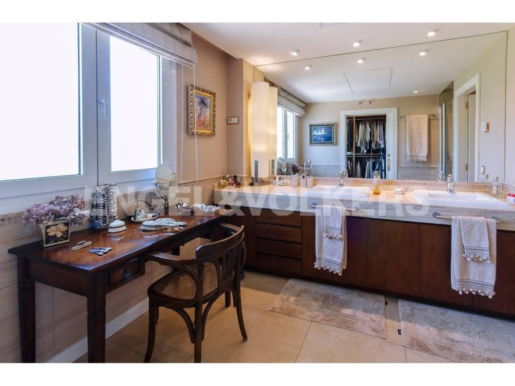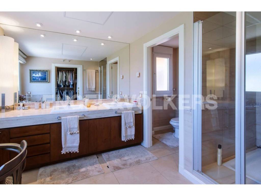La elegante escalera de mármol interior nos dirige a la planta primera y zona de descanso. En la misma, la máster suite es una pieza única de gran tamaño, con especial luz, terraza privada, zona de estar con chimenea, dos vestidores independientes y un gran baño. En esta planta además disponemos de 4 dormitorios en suite, con sus vestidores y armarios, y de una terraza independiente a modo de solárium con excelentes vistas.