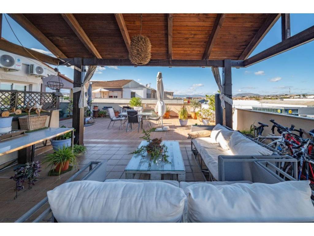 La terraza, de 140 m2, es el verdadero corazón del ático: riego por goteo, amplia, luminosa y perfectamente aprovechable durante todo el año. Incluye una parte cerrada vinculada al dormitorio principal, que aporta mayor intimidad y confort, además de distintas zonas diferenciadas para comedor exterior, chill out y solárium.