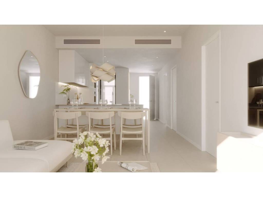 Los interiores siguen una distribución fluida e integrada, donde las áreas de estar se funden con cocinas de última generación equipadas con barra central, potenciando la entrada de luz y creando un ambiente funcional y acogedor.