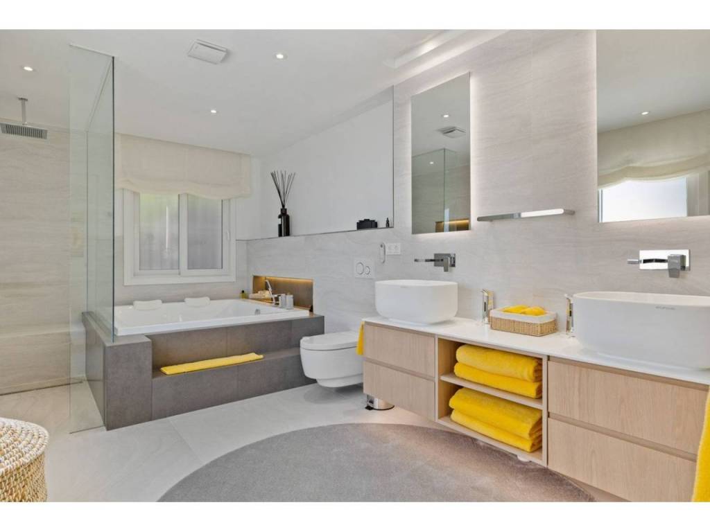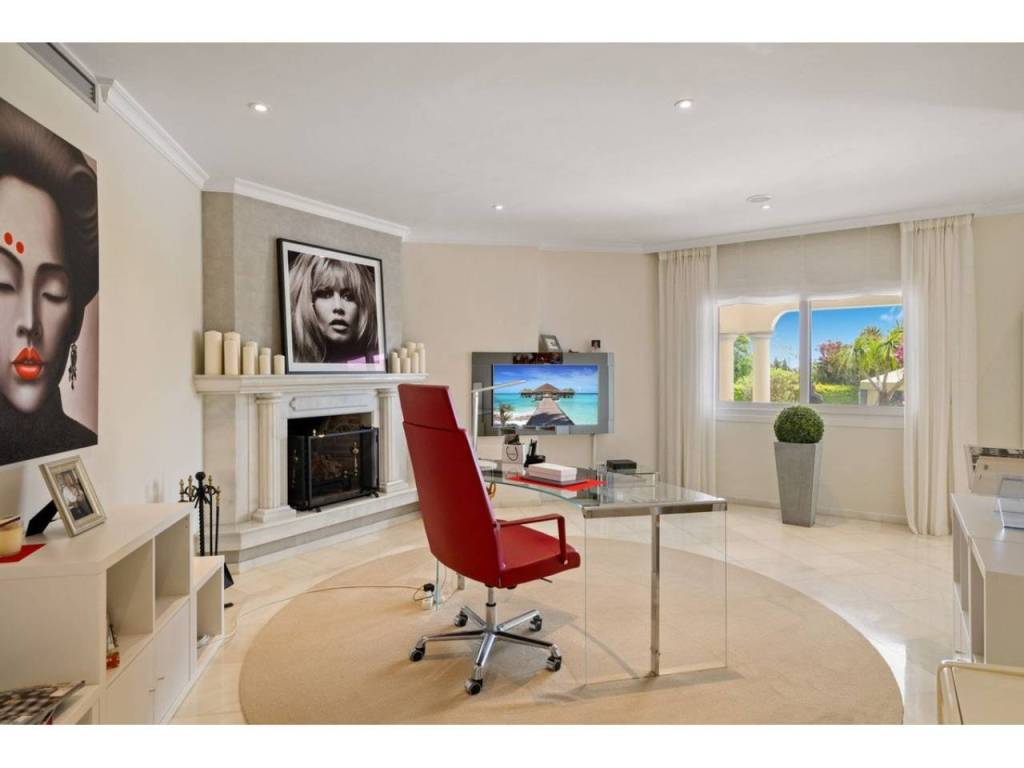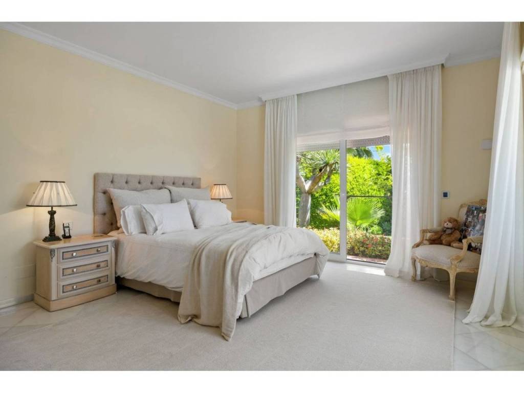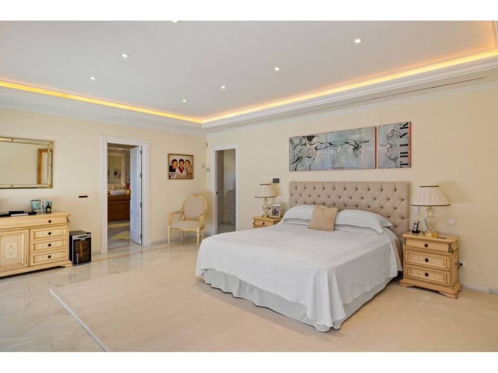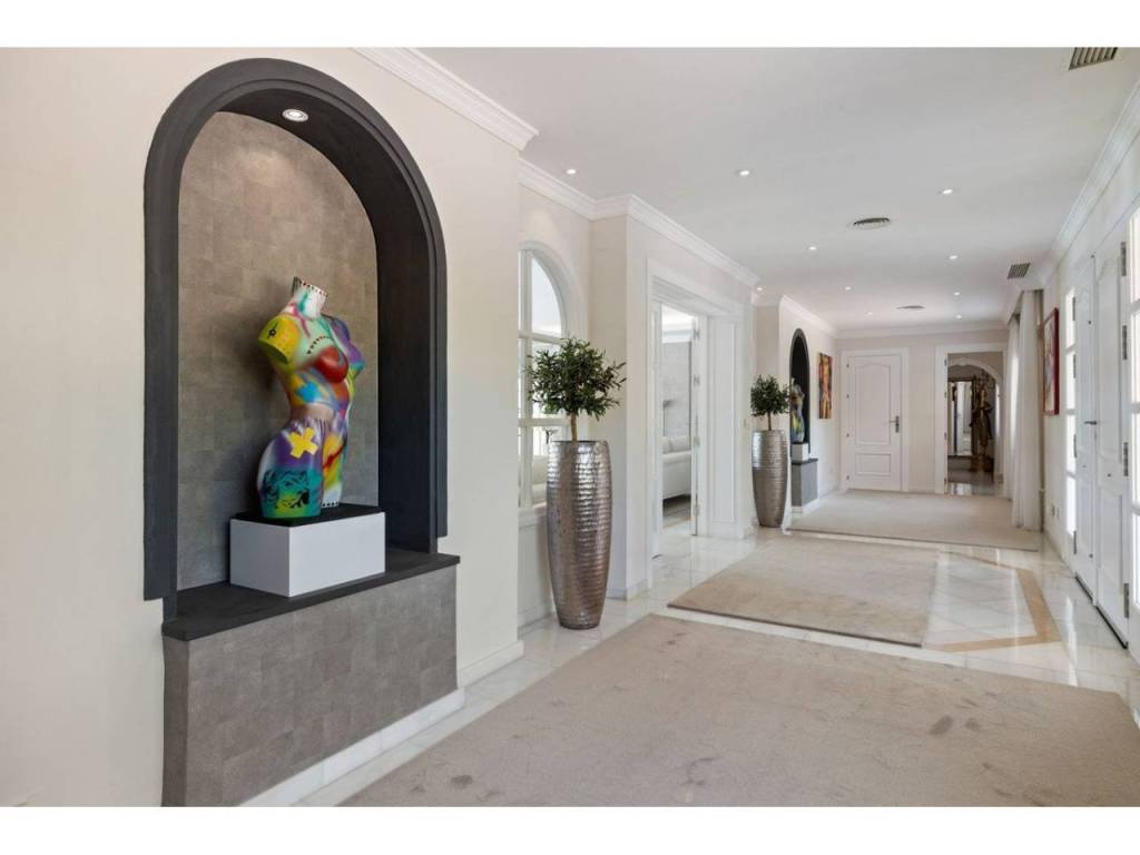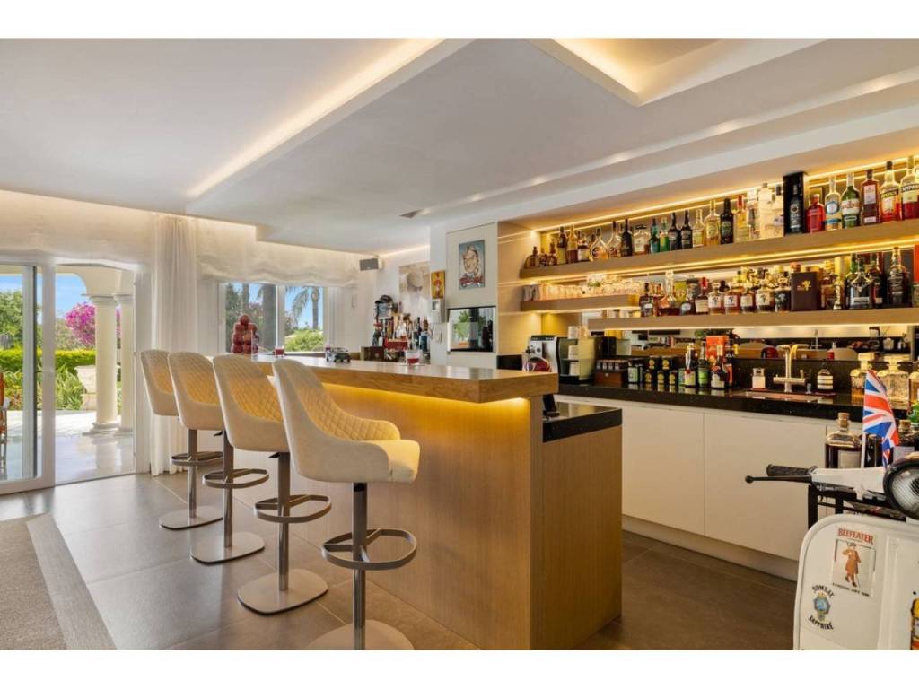 Planta principal: vestíbulo de entrada, amplio salón con chimenea y techos altos, comedor con cocina abierta totalmente equipada con electrodomésticos Siemens y Neff y zona de bar de entretenimiento. Cuatro dormitorios de invitados con baño, despacho, aseo de invitados, lavadero. Acceso a las terrazas cubiertas y abiertas desde las zonas de estar al jardín y la zona de la piscina.