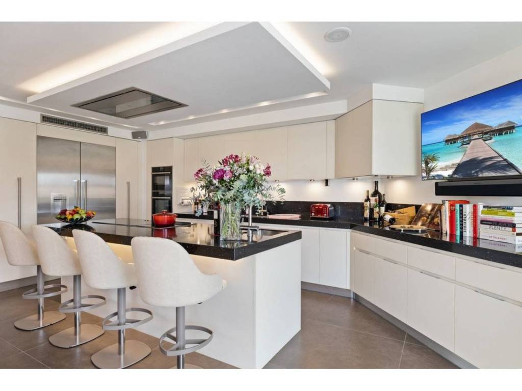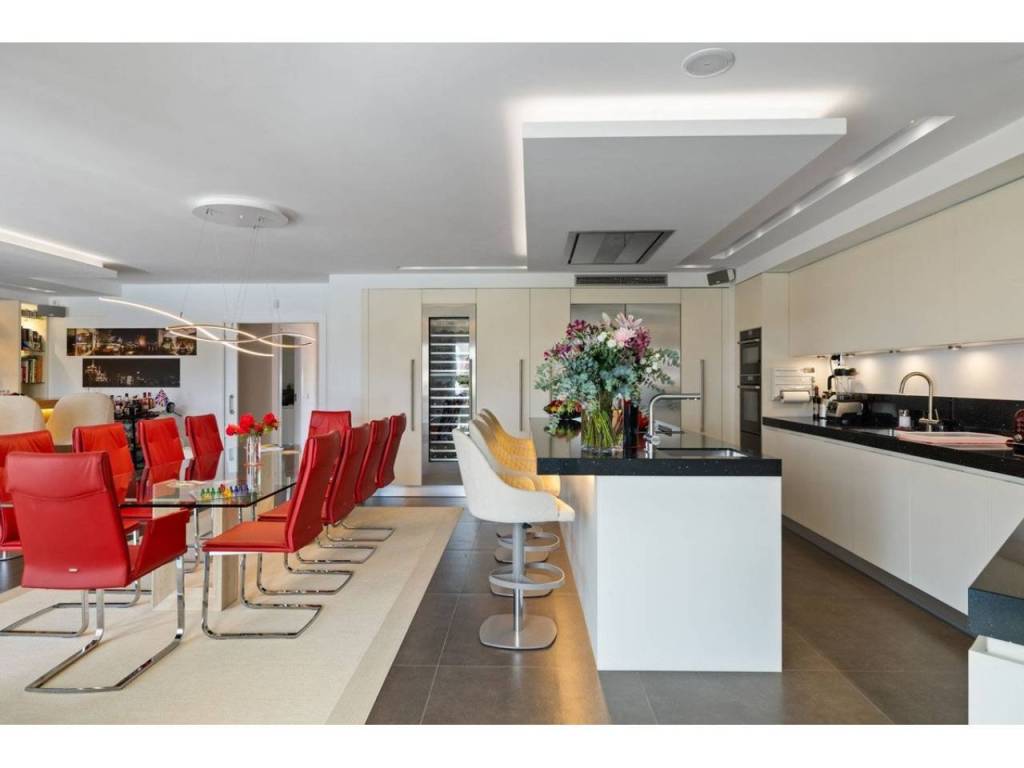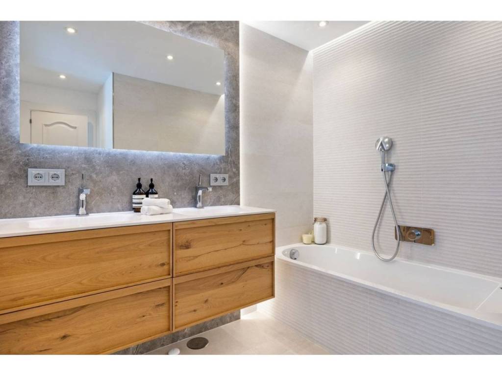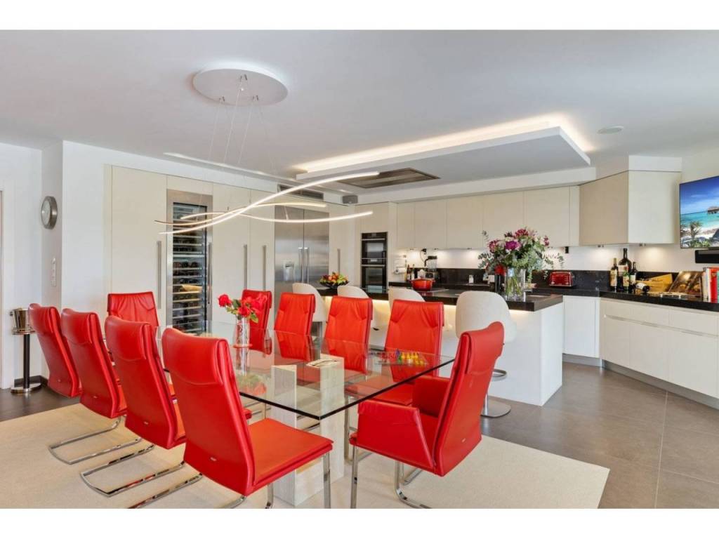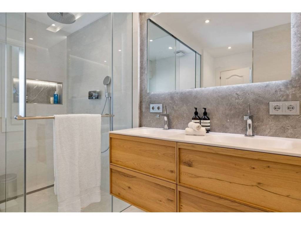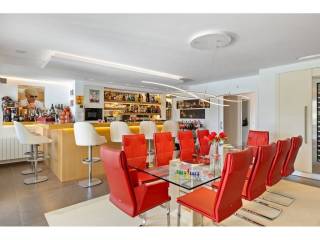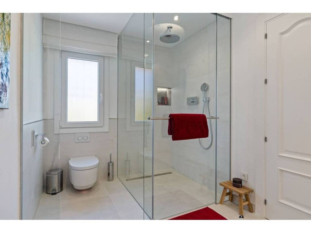 Planta principal: vestíbulo de entrada, amplio salón con chimenea y techos altos, comedor con cocina abierta totalmente equipada con electrodomésticos Siemens y Neff y zona de bar de entretenimiento. Cuatro dormitorios de invitados con baño, despacho, aseo de invitados, lavadero. Acceso a las terrazas cubiertas y abiertas desde las zonas de estar al jardín y la zona de la piscina.