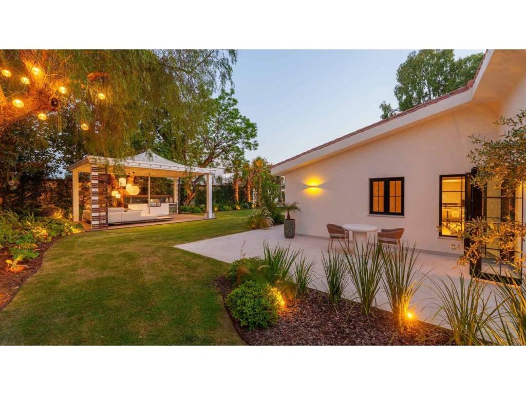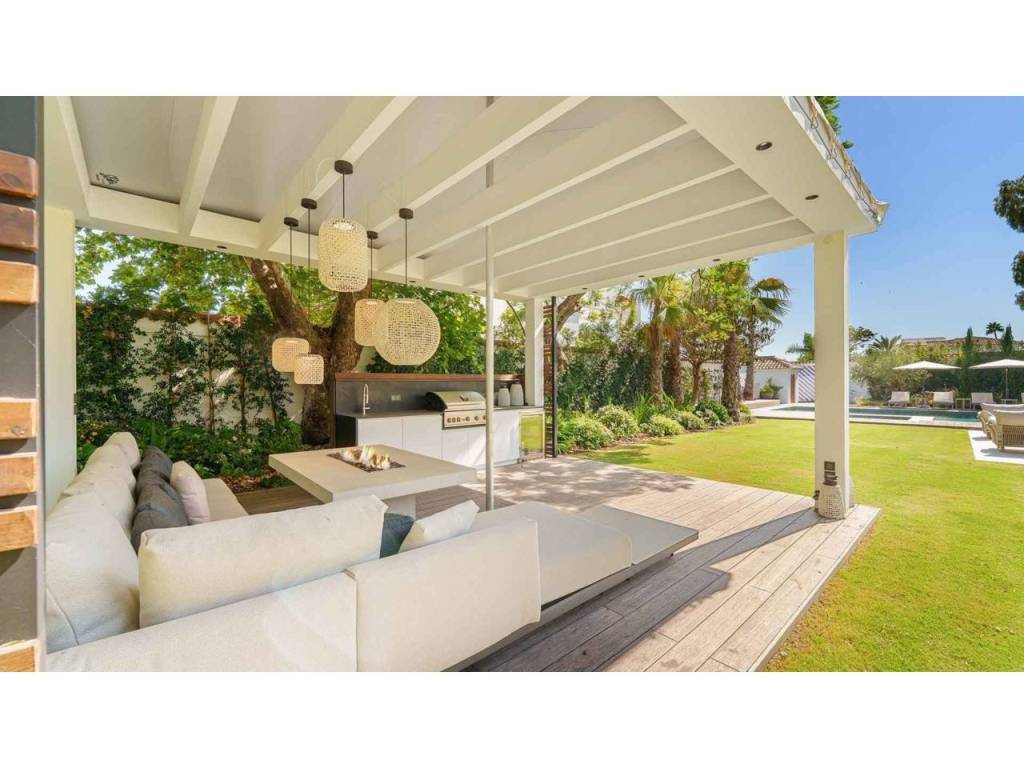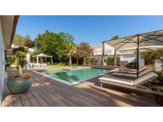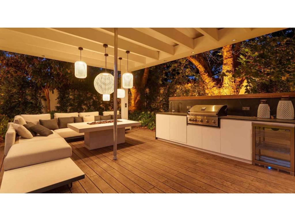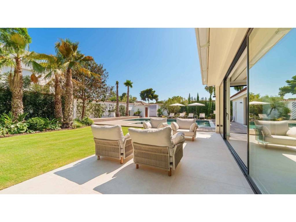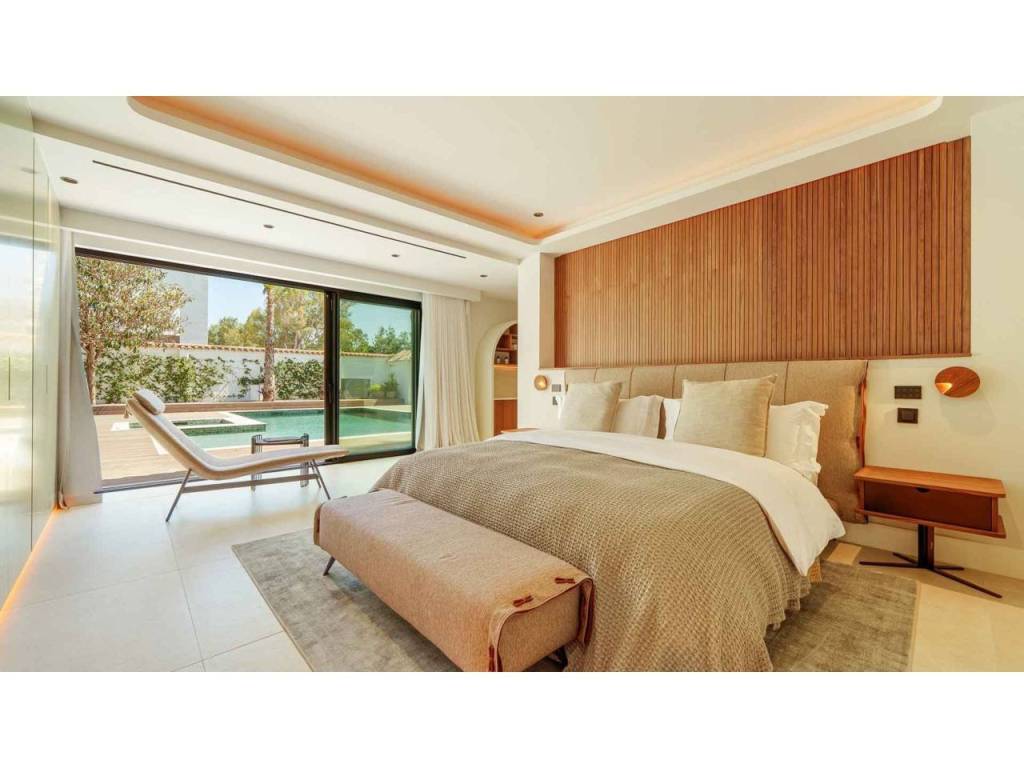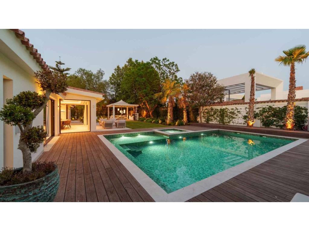 El exterior de la villa está pensado para maximizar la vida al aire libre. El jardín cuenta con una gran piscina central, rodeada por una tarima de madera elegante y equipada con tumbonas y zonas de sombra. Diversas áreas de descanso, una cocina exterior cubierta con barbacoa integrada y un salón al aire libre bajo pérgola permiten disfrutar del clima mediterráneo.