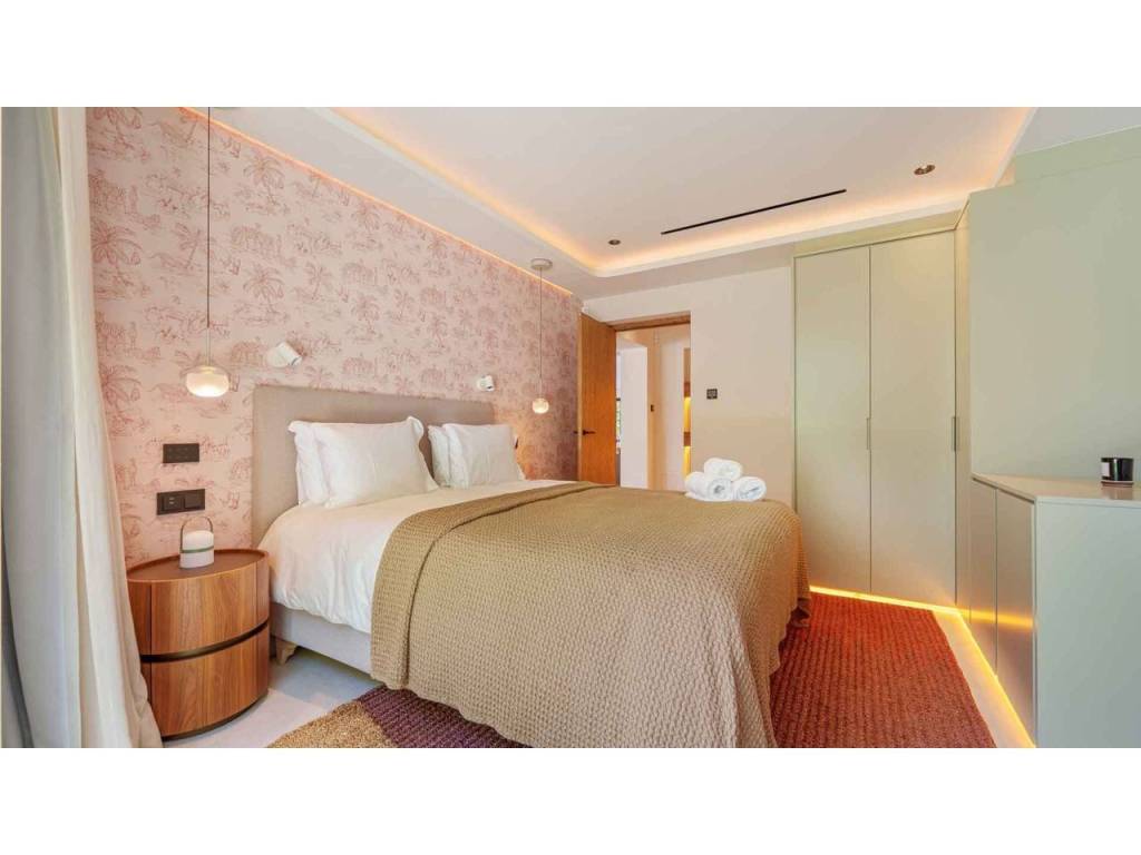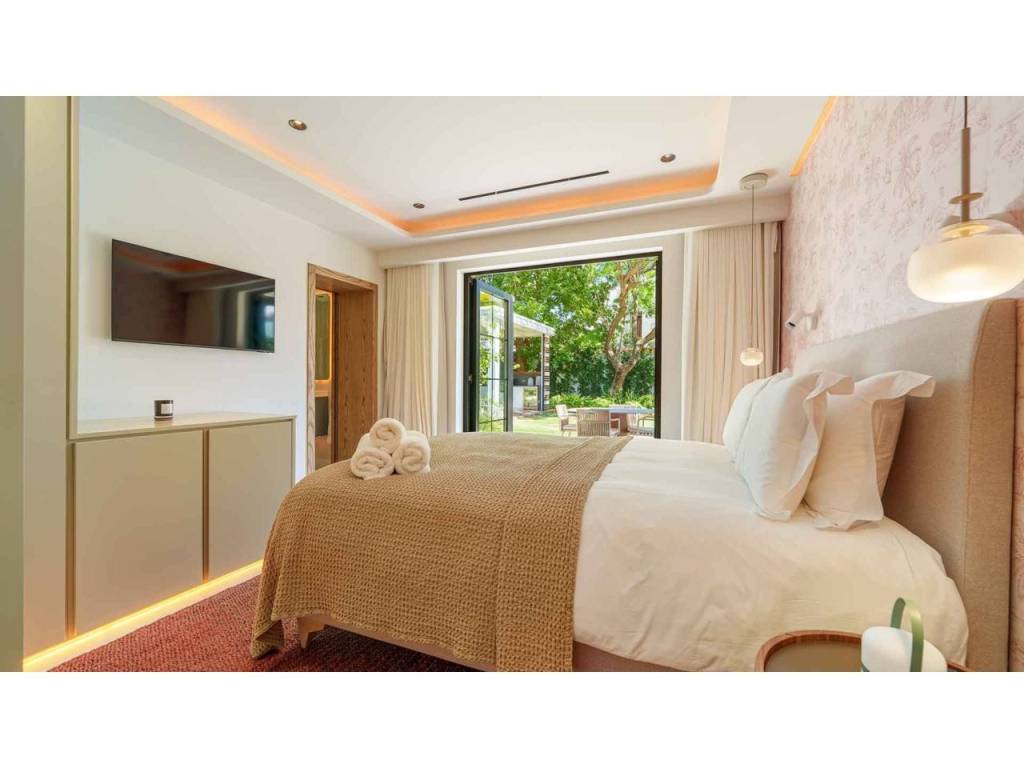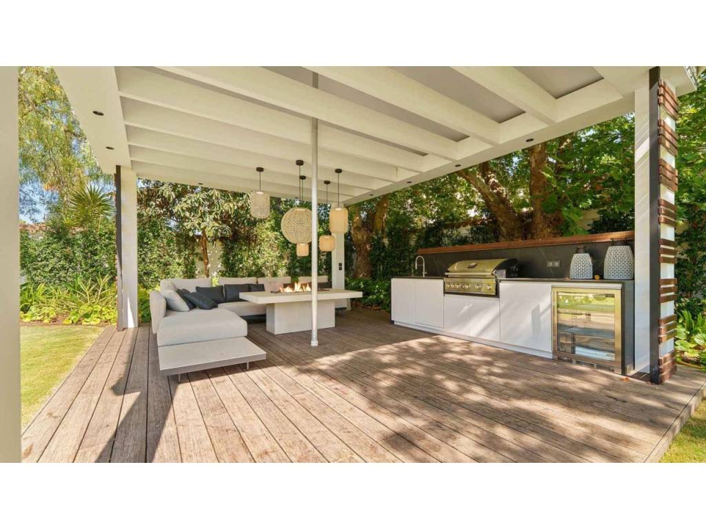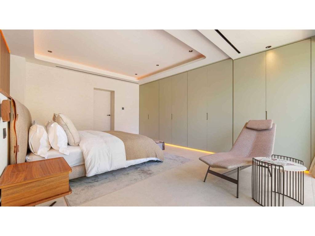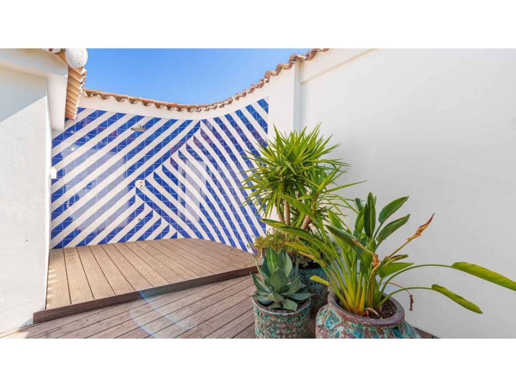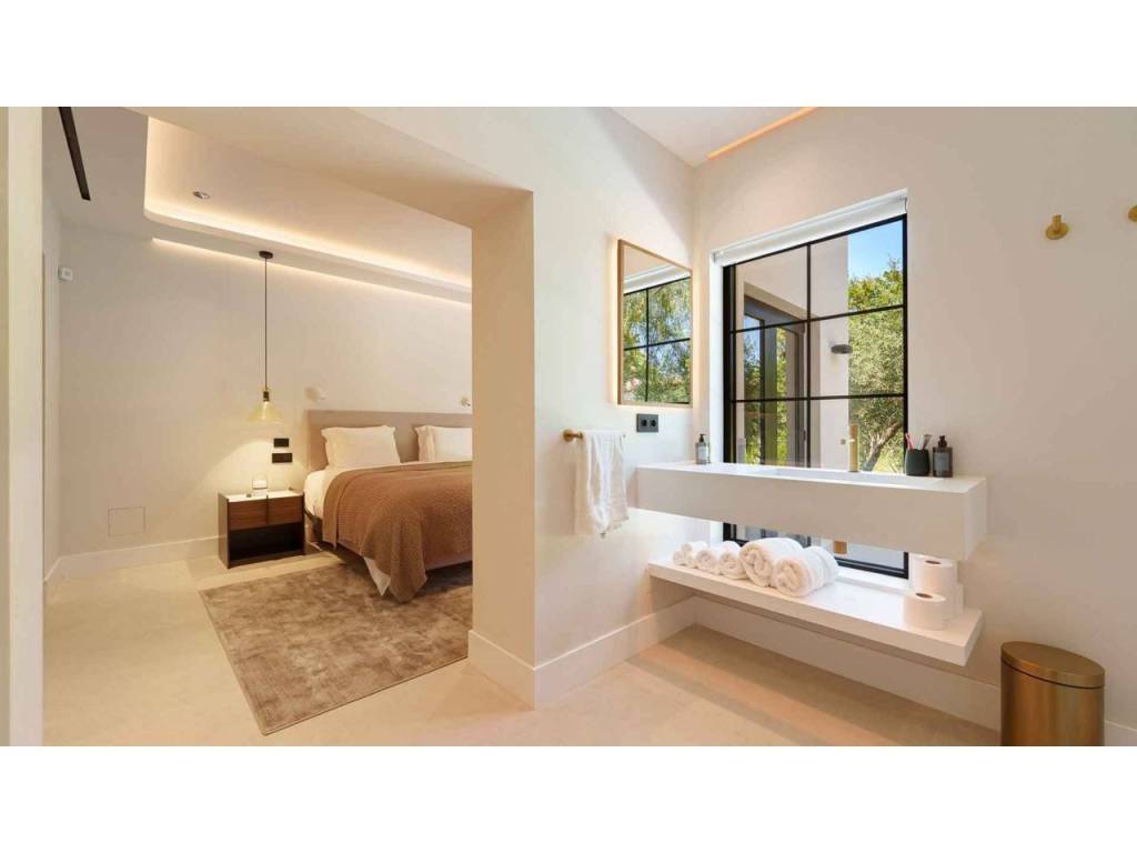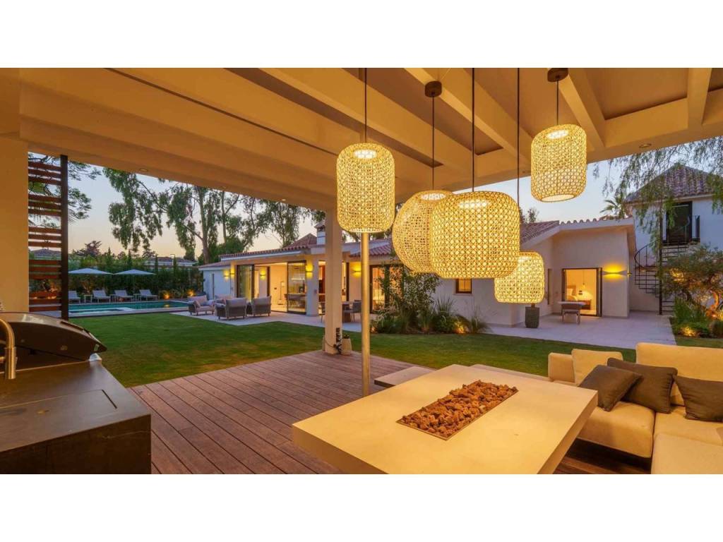 El exterior de la villa está pensado para maximizar la vida al aire libre. El jardín cuenta con una gran piscina central, rodeada por una tarima de madera elegante y equipada con tumbonas y zonas de sombra. Diversas áreas de descanso, una cocina exterior cubierta con barbacoa integrada y un salón al aire libre bajo pérgola permiten disfrutar del clima mediterráneo.